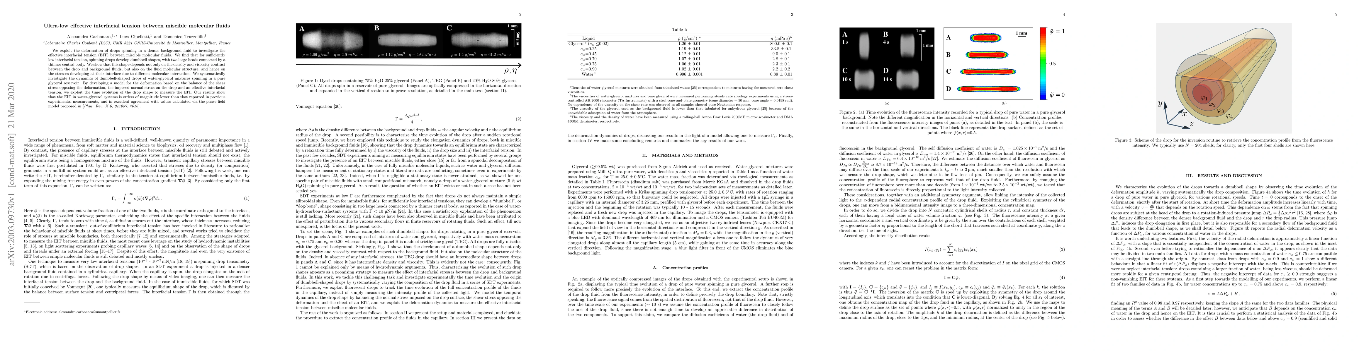 This study investigates the ultra-low effective interfacial tension (EIT) between miscible molecular fluids using spinning drops in a denser fluid, revealing that water-glycerol mixtures exhibit significantly lower EIT than previously reported. The dumbbell shape of spinning drops is analyzed to quantify the EIT, showing strong dependence on molecular interactions and fluid structure.