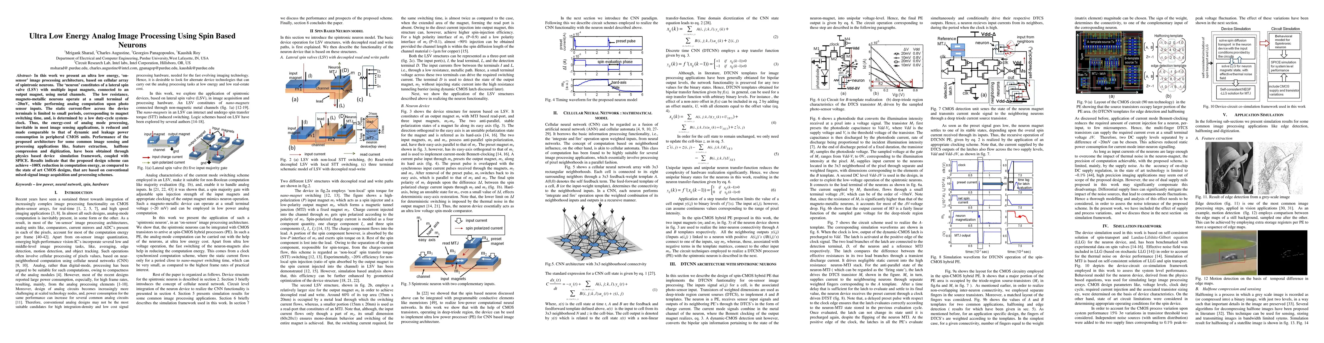 This paper proposes an ultra low energy image processing architecture using spin-based neurons, achieving significant energy reduction compared to conventional CMOS designs. The architecture employs lateral spin valves for analog computation, demonstrating over two orders of magnitude lower energy consumption in image sensing applications.