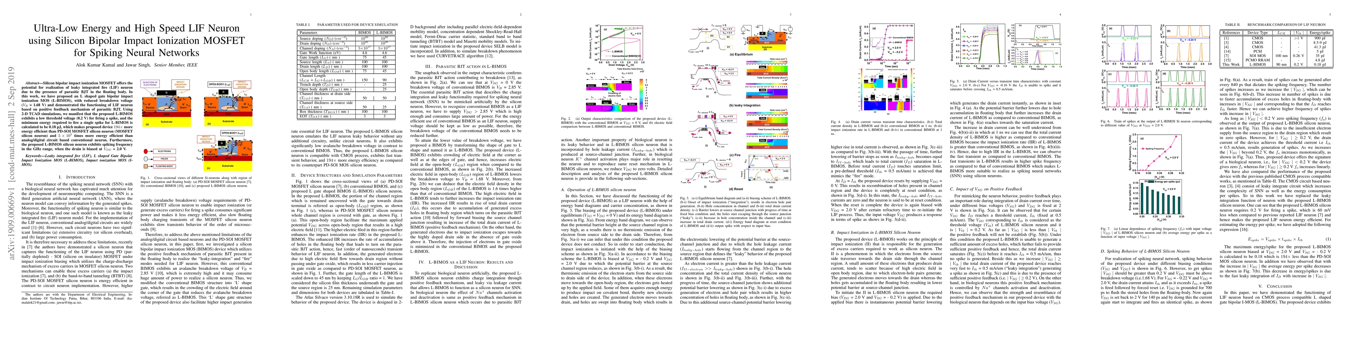 This paper proposes an L-shaped gate bipolar impact ionization MOSFET (L-BIMOS) for ultra-low energy and high-speed leaky integrated fire (LIF) neurons in spiking neural networks. The L-BIMOS demonstrates a minimum energy of 0.18 pJ per spike, achieving 194x and 5,000x energy efficiency improvements over PD-SOI MOSFET and conventional neurons, respectively, while operating in the GHz range.
