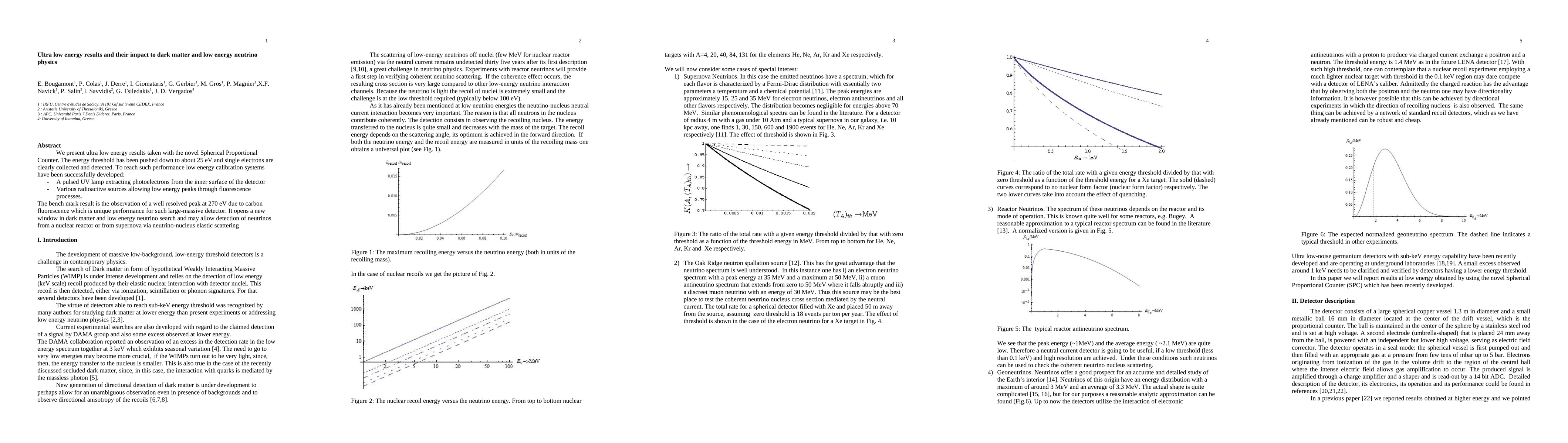We present ultra low energy results taken with the novel Spherical Proportional Counter. The energy threshold has been pushed down to about 25 eV and single electrons are clearly collected and detected. To reach such performance low energy calibration systems have been successfully developed: - A pulsed UV lamp extracting photoelectrons from the inner surface of the detector - Various radioactive sources allowing low energy peaks through fluorescence processes. The bench mark result is the observation of a well resolved peak at 270 eV due to carbon fluorescence which is unique performance for such large-massive detector. It opens a new window in dark matter and low energy neutrino search and may allow detection of neutrinos from a nuclear reactor or from supernova via neutrino-nucleus elastic scattering