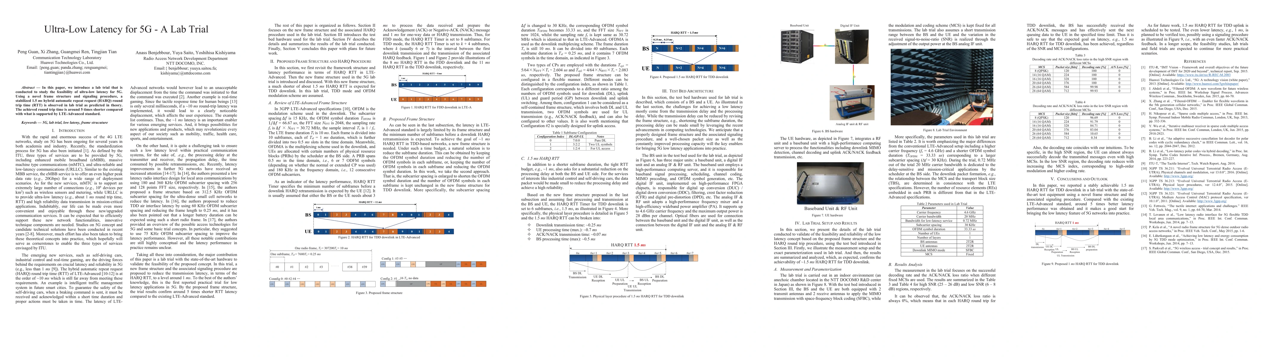 In this paper, we introduce a lab trial that is conducted to study the feasibility of ultra-low latency for 5G. Using a novel frame structure and signaling procedure, a stabilized 1.5 ms hybrid automatic repeat request (HARQ) round trip time (RTT) is observed in lab trial as predicted in theory. The achieved round trip time is around 5 times shorter compared with what is supported by LTE-Advanced standard.
