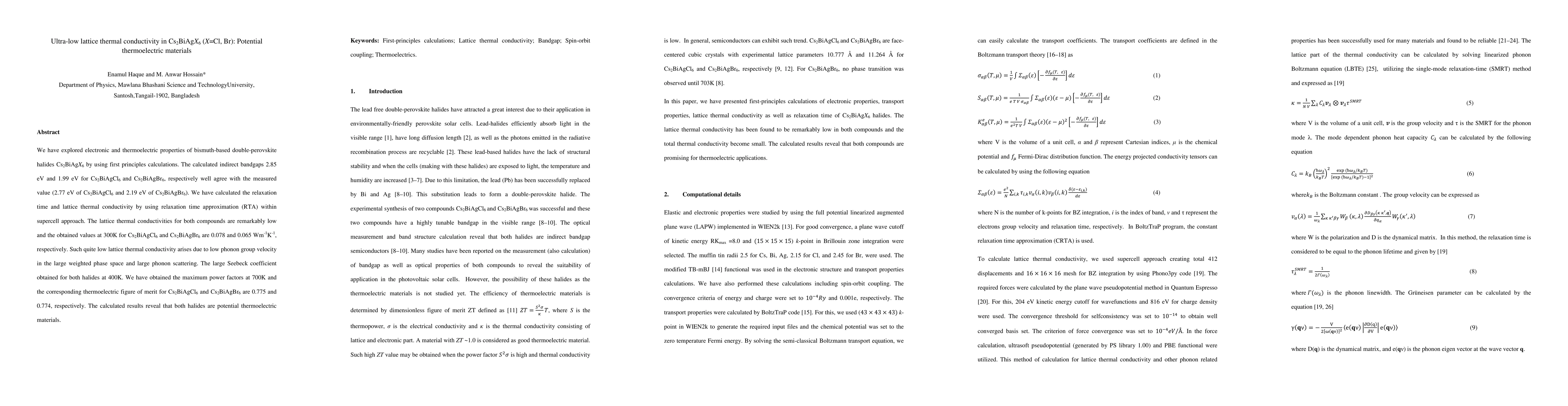Researchers discovered two bismuth-based compounds with ultra-low lattice thermal conductivity, making them potential thermoelectric materials, with Seebeck coefficients over 400K.