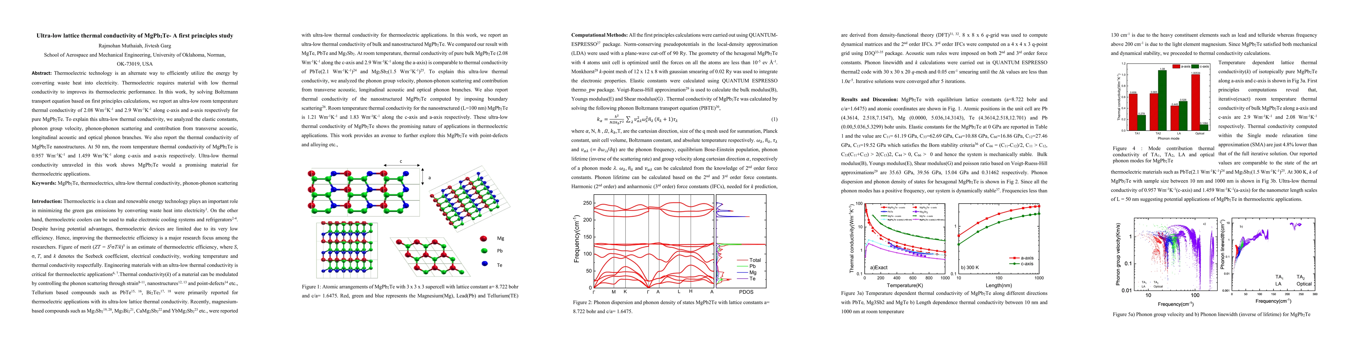 This study investigates the thermoelectric potential of MgPb$_2$Te using first principles calculations, revealing ultra-low thermal conductivity of 2.08 Wm$^{-1}$K$^{-1}$ along the c-axis and 2.9 Wm$^{-1}$K$^{-1}$ along the a-axis at room temperature, indicating its promise for thermoelectric applications. Additionally, MgPb$_2$Te nanostructures exhibit further reduced thermal conductivity, suggesting enhanced thermoelectric performance.