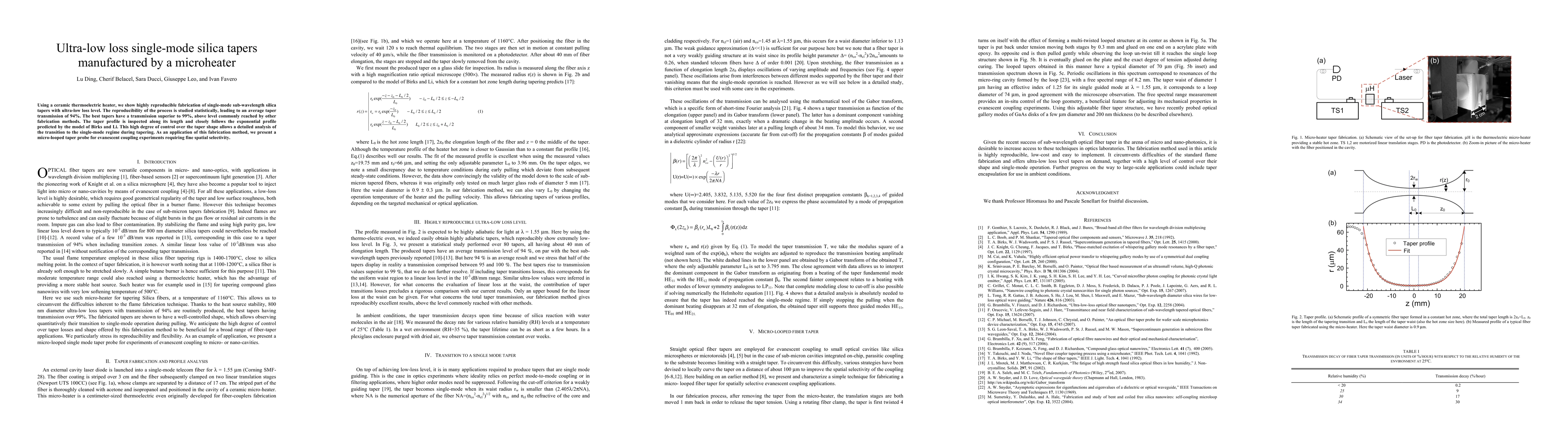 This paper details the fabrication of ultra-low loss single-mode silica tapers using a ceramic thermoelectric heater, achieving an average transmission of 94% and the best tapers exceeding 99%. The method's reproducibility and precise taper profile enable detailed analysis of the single-mode transition.