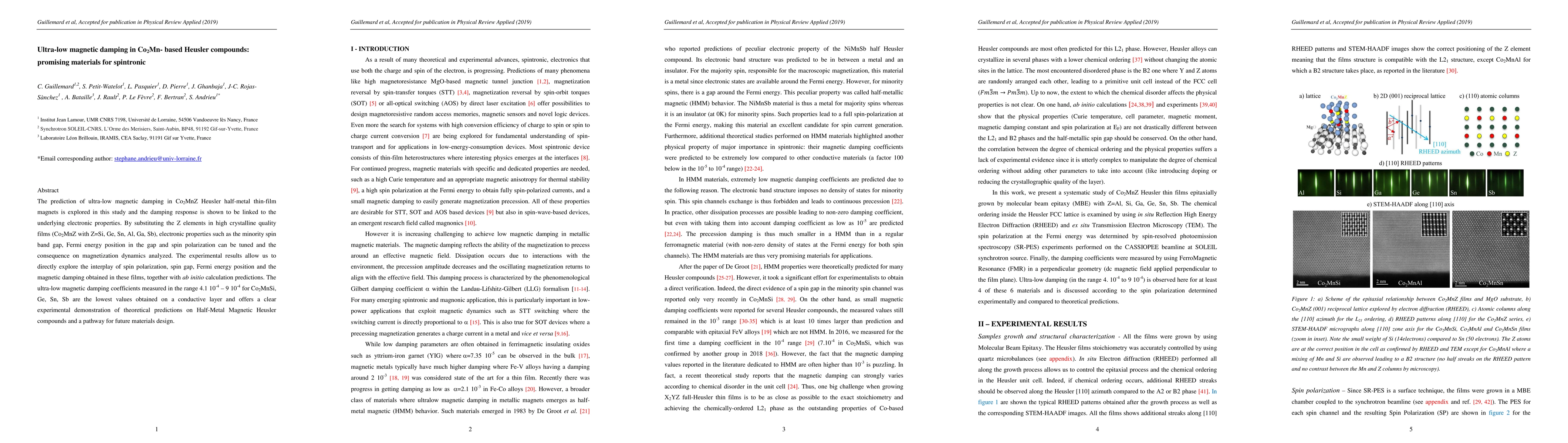 The prediction of ultra-low magnetic damping in Co 2 MnZ Heusler half-metal thin-film magnets is explored in this study and the damping response is shown to be linked to the underlying electronic properties. By substituting the Z elements in high crystalline quality films (Co 2 MnZ with Z=Si, Ge, Sn, Al, Ga, Sb), electronic properties such as the minority spin band gap, Fermi energy position in the gap and spin polarization can be tuned and the consequence on magnetization dynamics analyzed. The experimental results allow us to directly explore the interplay of spin polarization, spin gap, Fermi energy position and the magnetic damping obtained in these films, together with ab initio calculation predictions. The ultra-low magnetic damping coefficients measured in the range 4.1 10-4-9 10-4 for Co 2 MnSi, Ge, Sn, Sb are the lowest values obtained on a conductive layer and offers a clear experimental demonstration of theoretical predictions on Half-Metal Magnetic Heusler compounds and a pathway for future materials design.