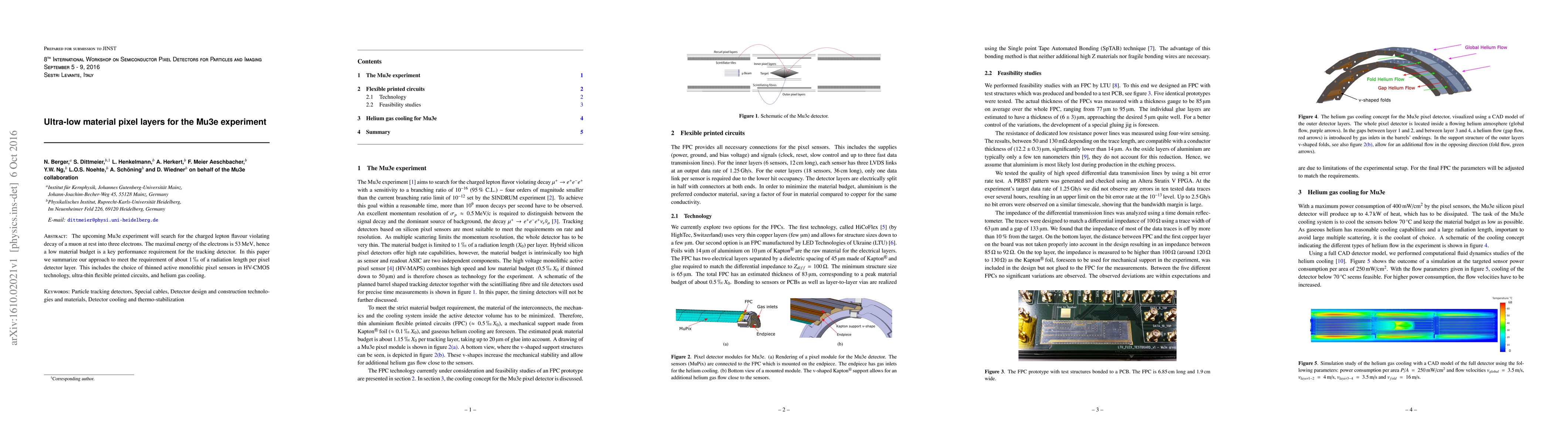 The upcoming Mu3e experiment will search for the charged lepton flavour violating decay of a muon at rest into three electrons. The maximal energy of the electrons is 53 MeV, hence a low material budget is a key performance requirement for the tracking detector. In this paper we summarize our approach to meet the requirement of about 0.1 % of a radiation length per pixel detector layer. This includes the choice of thinned active monolithic pixel sensors in HV-CMOS technology, ultra-thin flexible printed circuits, and helium gas cooling.