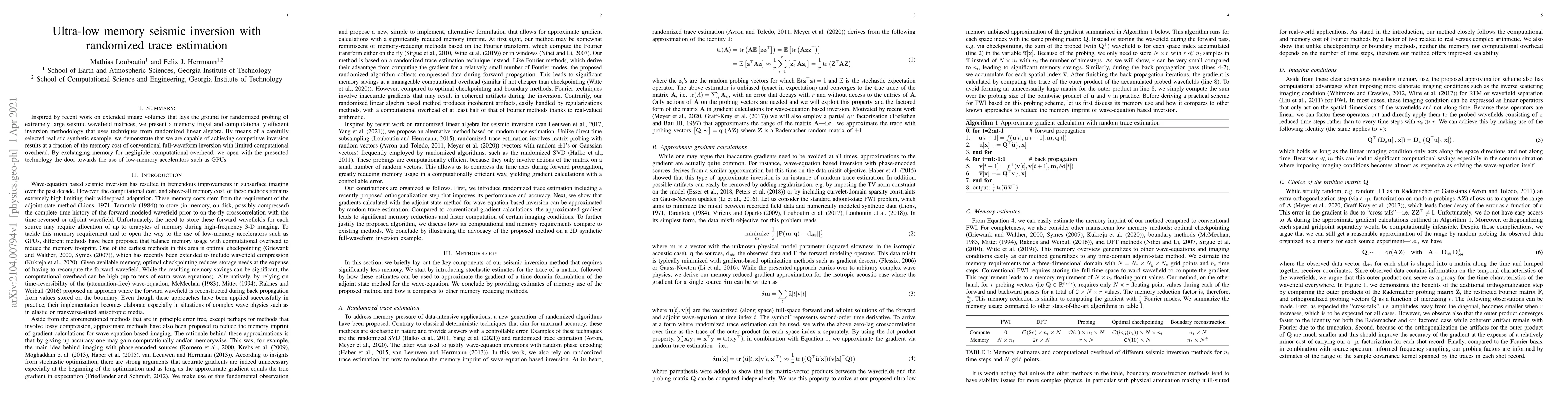 Inspired by recent work on extended image volumes that lays the ground for randomized probing of extremely large seismic wavefield matrices, we present a memory frugal and computationally efficient inversion methodology that uses techniques from randomized linear algebra. By means of a carefully selected realistic synthetic example, we demonstrate that we are capable of achieving competitive inversion results at a fraction of the memory cost of conventional full-waveform inversion with limited computational overhead. By exchanging memory for negligible computational overhead, we open with the presented technology the door towards the use of low-memory accelerators such as GPUs.