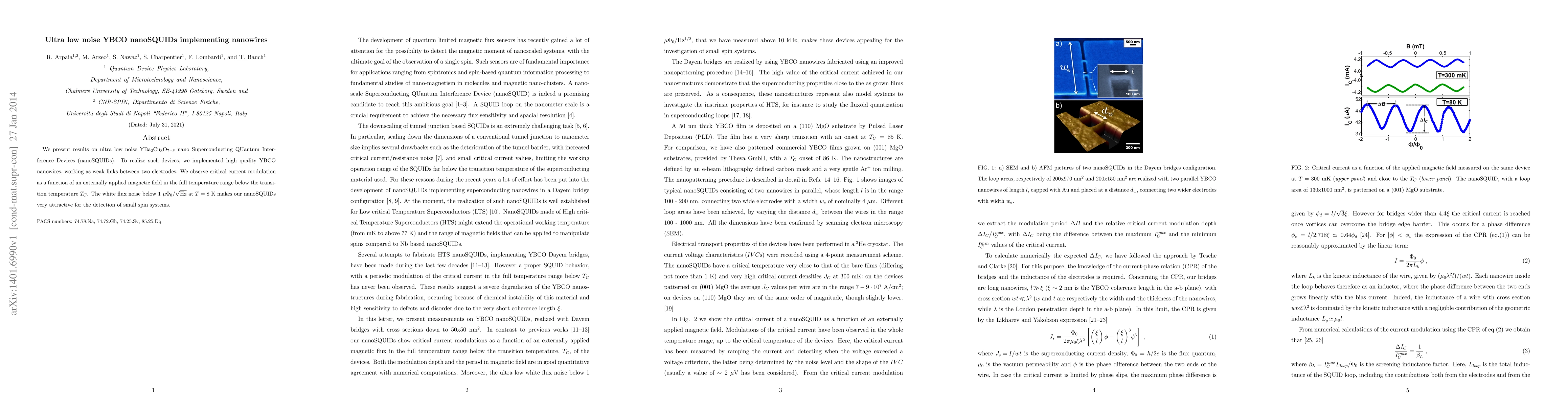 We present results on ultra low noise YBa$_2$Cu$_3$O$_{7-\delta}$ nano Superconducting QUantum Interference Devices (nanoSQUIDs). To realize such devices, we implemented high quality YBCO nanowires, working as weak links between two electrodes. We observe critical current modulation as a function of an externally applied magnetic field in the full temperature range below the transition temperature $T_C$. The white flux noise below 1 $\mu \Phi_0/\sqrt{\mathrm{Hz}}$ at T = 8 K makes our nanoSQUIDs very attractive for the detection of small spin systems.