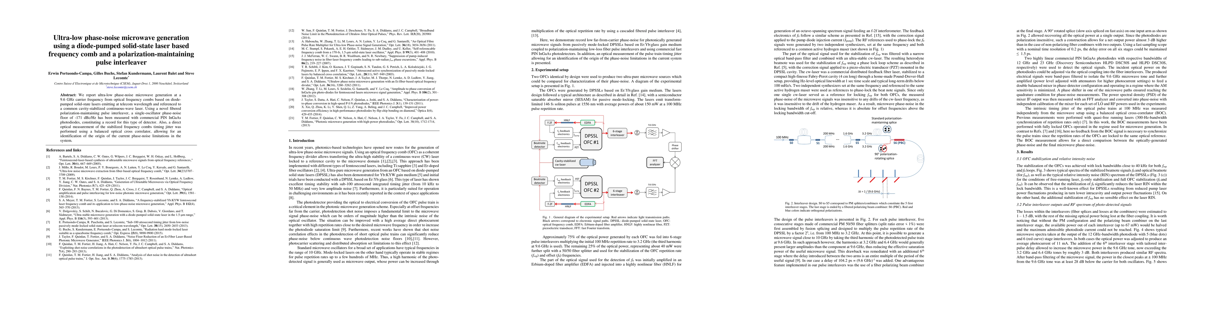This paper presents ultra-low phase-noise microwave generation at 9.6 GHz using a diode-pumped solid-state laser frequency comb and a novel polarization-maintaining pulse interleaver, achieving a record phase-noise floor of -171 dBc/Hz. The study also identifies timing jitter sources in the stabilized frequency combs via direct optical measurement.
