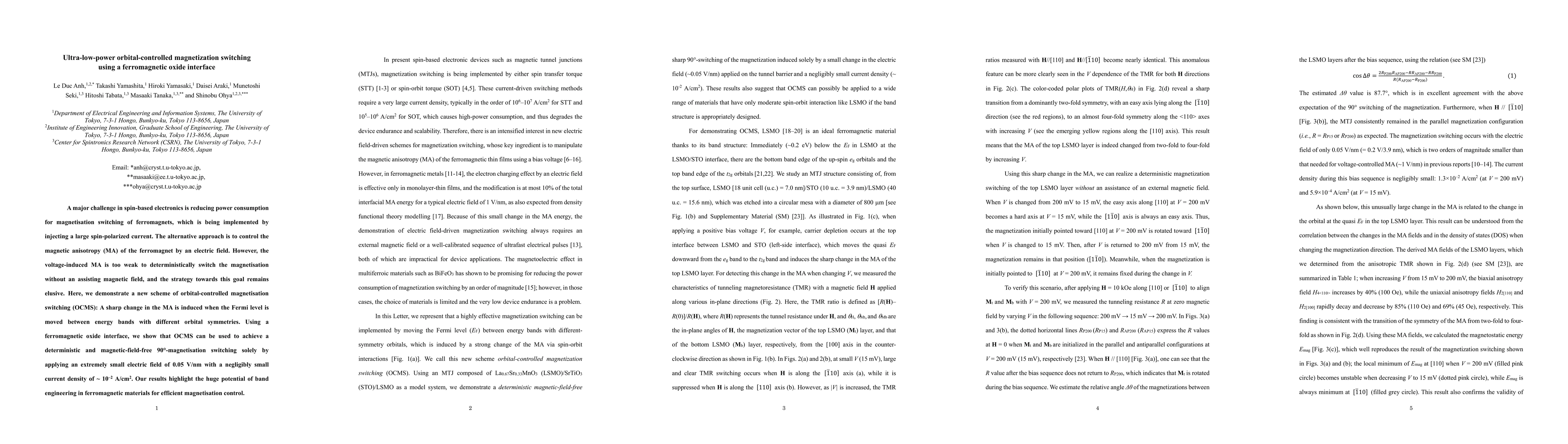 This paper presents a novel orbital-controlled magnetization switching (OCMS) method using a ferromagnetic oxide interface, enabling deterministic and magnetic-field-free 90-degree magnetization switching with minimal power consumption via a small electric field. The approach highlights the potential of band engineering in achieving efficient magnetization control.