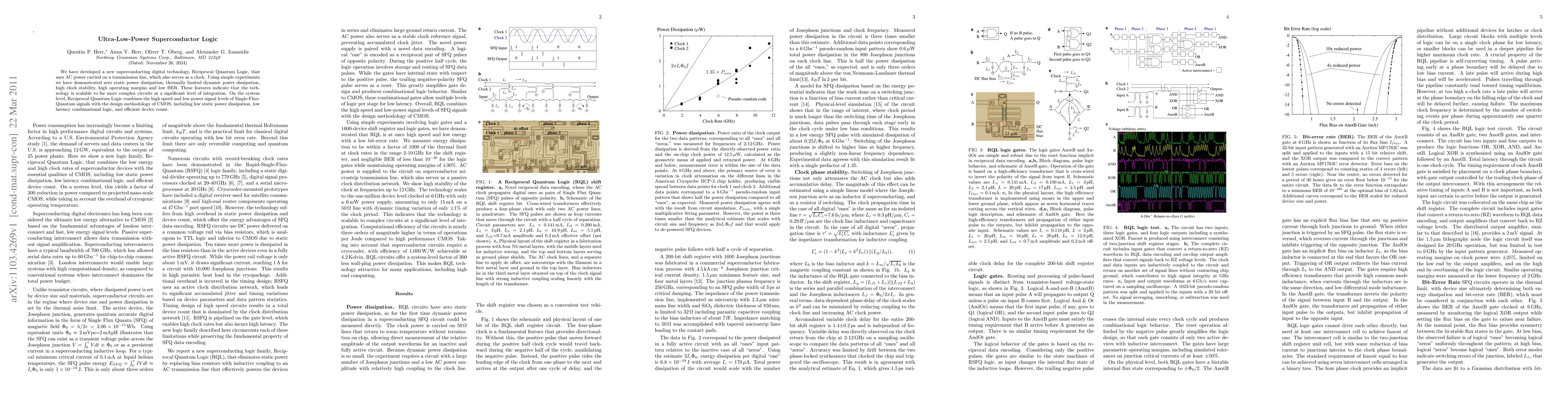 We have developed a new superconducting digital technology, Reciprocal Quantum Logic, that uses AC power carried on a transmission line, which also serves as a clock. Using simple experiments we have demonstrated zero static power dissipation, thermally limited dynamic power dissipation, high clock stability, high operating margins and low BER. These features indicate that the technology is scalable to far more complex circuits at a significant level of integration. On the system level, Reciprocal Quantum Logic combines the high speed and low-power signal levels of Single-Flux- Quantum signals with the design methodology of CMOS, including low static power dissipation, low latency combinational logic, and efficient device count.