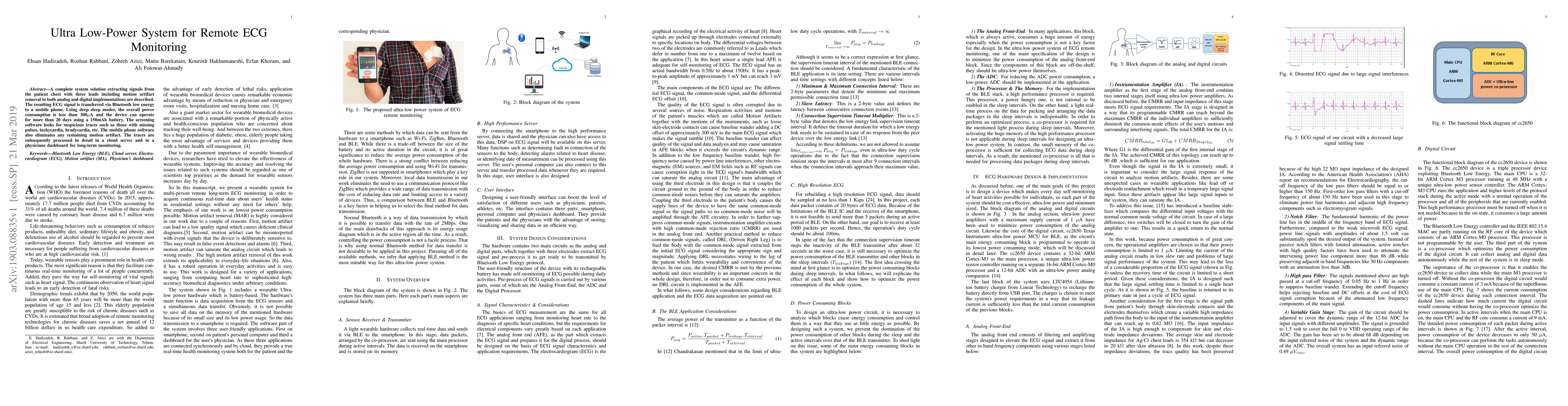 A complete system solution extracting signals from the patient chest with three leads including motion artifact removal in both analog and digital implementations are described. The resulting ECG signal is transferred via Bluetooth low energy to a mobile phone. Using deep sleep modes, the overall power consumption is less than 300 $\mu$A and the device can operate for more than 20 days using a 150mAh battery. The screening software looks for suspicious traces such as those with missing pulses, tachycardia, bradycardia, etc. The mobile phone software also eliminates any remaining motion artifact. The traces are subsequently processed in detail in a cloud server and to a physicians dashboard for long-term monitoring.