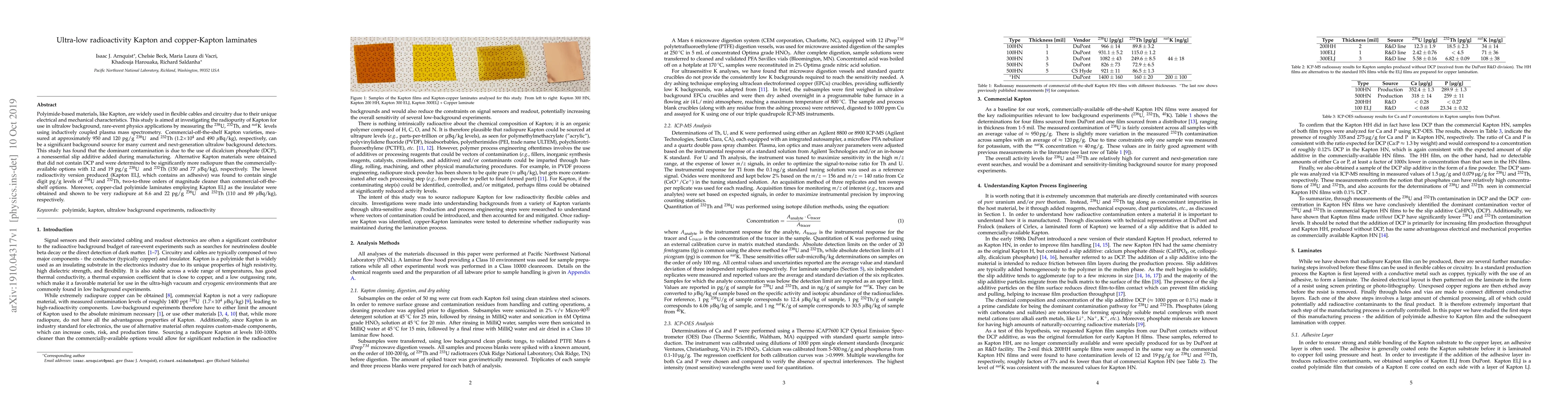Polyimide-based materials, like Kapton, are widely used in flexible cables and circuitry due to their unique electrical and mechanical characteristics. This study is aimed at investigating the radiopurity of Kapton for use in ultralow background, rare-event physics applications by measuring the $^{238}$U, $^{232}$Th, and $^{nat}$K levels using inductively coupled plasma mass spectrometry. Commercial-off-the-shelf Kapton varieties, measured at approximately 950 and 120 pg/g $^{238}$U and $^{232}$Th (1.2$\times$10$^4$ and 490 $\mu$Bq/kg), respectively, can be a significant background source for many current and next-generation ultralow background detectors. This study has found that the dominant contamination is due to the use of dicalcium phosphate (DCP), a nonessential slip additive added during manufacturing. Alternative Kapton materials were obtained that did not contain DCP and were determined to be significantly more radiopure than the commercially-available options with 12 and 19 pg/g $^{238}$U and $^{232}$Th (150 and 77 $\mu$Bq/kg), respectively. The lowest radioactivity version produced (Kapton ELJ, which contains an adhesive) was found to contain single digit pg/g levels of $^{238}$U and $^{232}$Th, two-to-three orders of magnitude cleaner than commercial-off-the-shelf options. Moreover, copper-clad polyimide laminates employing Kapton ELJ as the insulator were obtained and shown to be very radiopure at 8.6 and 22 pg/g $^{238}$U and $^{232}$Th (110 and 89 $\mu$Bq/kg), respectively.