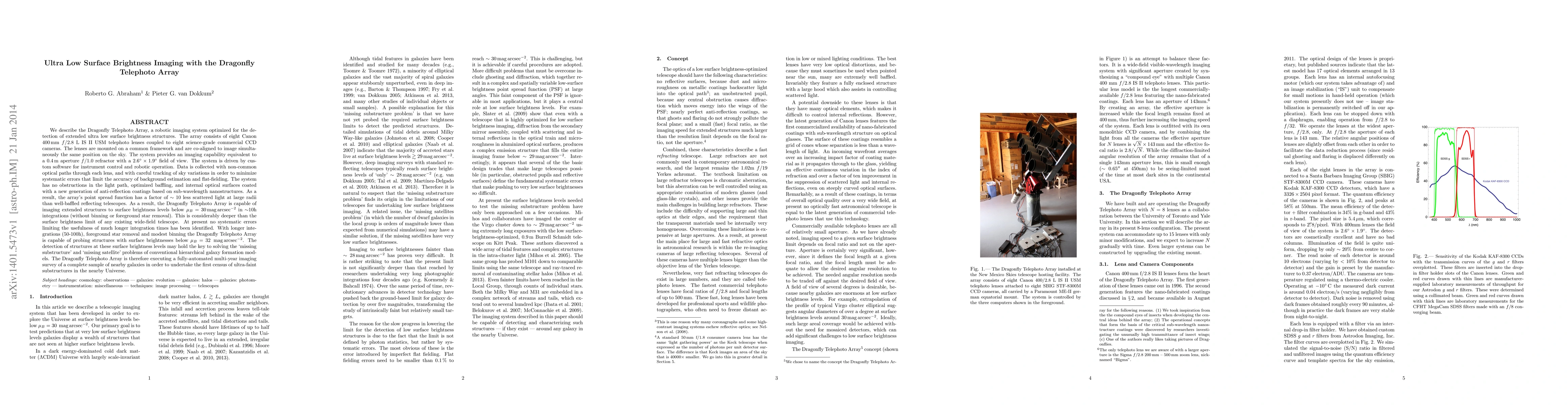 We describe the Dragonfly Telephoto Array, a robotic imaging system optimized for the detection of extended ultra low surface brightness structures. The array consists of eight Canon 400mm f/2.8 telephoto lenses coupled to eight science-grade commercial CCD cameras. The lenses are mounted on a common framework and are co-aligned to image simultaneously the same position on the sky. The system provides an imaging capability equivalent to a 0.4m aperture f/1.0 refractor with a 2.6 deg X 1.9 deg field of view. The system has no obstructions in the light path, optimized baffling, and internal optical surfaces coated with a new generation of anti-reflection coatings based on sub-wavelength nanostructures. As a result, the array's point spread function has a factor of ~10 less scattered light at large radii than well-baffled reflecting telescopes. The Dragonfly Telephoto Array is capable of imaging extended structures to surface brightness levels below 30 mag/arcsec^2 in 10h integrations (without binning or foreground star removal). This is considerably deeper than the surface brightness limit of any existing wide-field telescope. At present no systematic errors limiting the usefulness of much longer integration times has been identified. With longer integrations (50-100h), foreground star removal and modest binning the Dragonfly Telephoto Array is capable of probing structures with surface brightnesses below 32 mag/arcsec^2. Detection of structures at these surface brightness levels may hold the key to solving the "missing substructure" and "missing satellite" problems of conventional hierarchical galaxy formation models. The Dragonfly Telephoto Array is therefore executing a fully-automated multi-year imaging survey of a complete sample of nearby galaxies in order to undertake the first census of ultra-faint substructures in the nearby Universe.