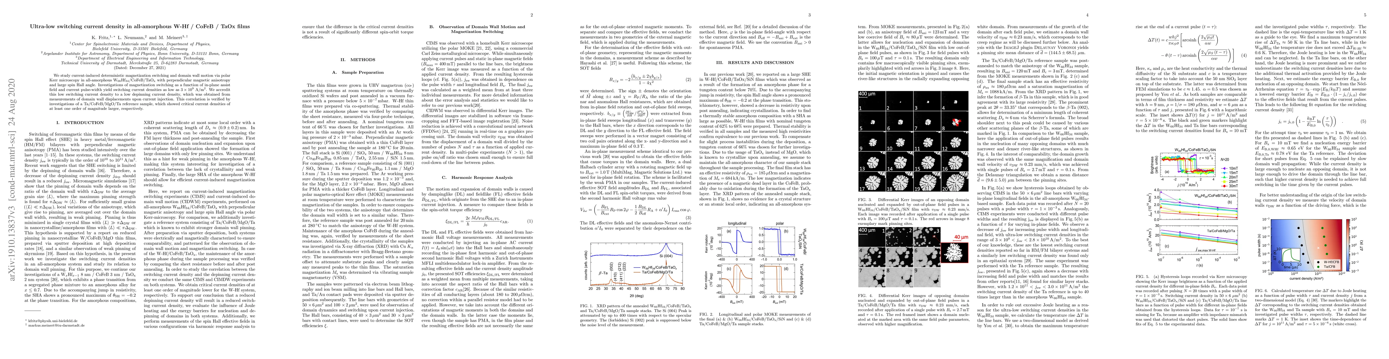 This paper investigates ultra-low switching current densities in all-amorphous W-Hf/CoFeB/TaOx films, achieving switching currents as low as $3\times 10^{9}$ A/m$^2$ due to low depinning current density, verified by comparison with a Ta/CoFeB/MgO/Ta reference sample.