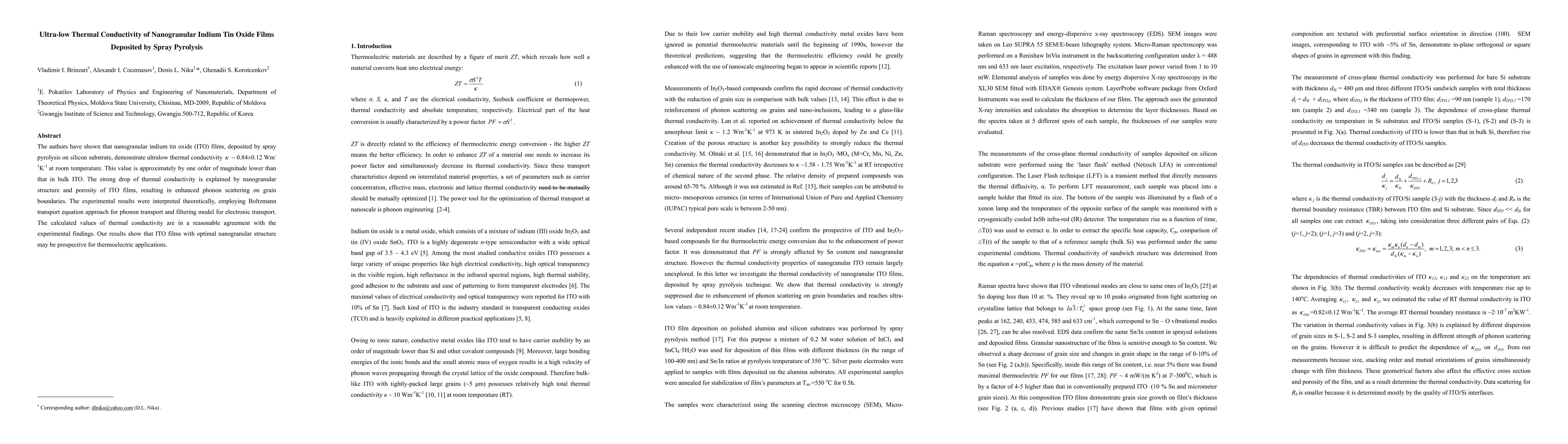 Nanogranular indium tin oxide (ITO) films deposited via spray pyrolysis exhibit ultra-low thermal conductivity (~0.84 ± 0.12 Wm⁻¹K⁻¹), significantly lower than bulk ITO, due to enhanced phonon scattering from grain boundaries and porosity. Theoretical models support these findings, suggesting potential for thermoelectric applications.