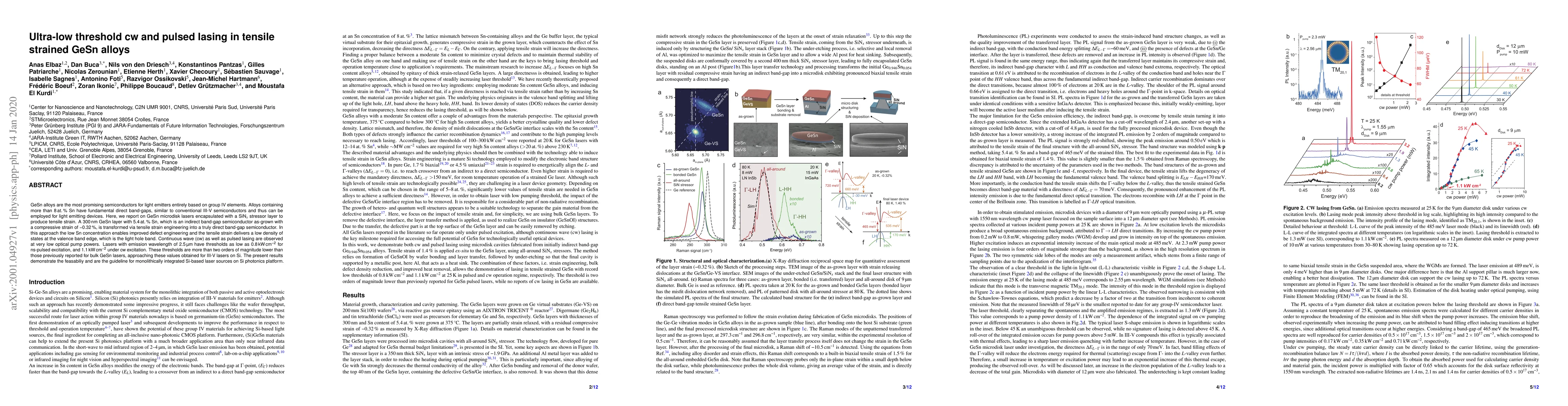 This paper reports on the successful transformation of tensile strained GeSn microdisk lasers into direct band-gap semiconductors, achieving ultra-low threshold lasing at 2.5 µm. The use of a SiNx stressor layer and low Sn concentration enables defect engineering and low valence band edge density, resulting in lasing thresholds two orders of magnitude lower than previous bulk GeSn lasers.