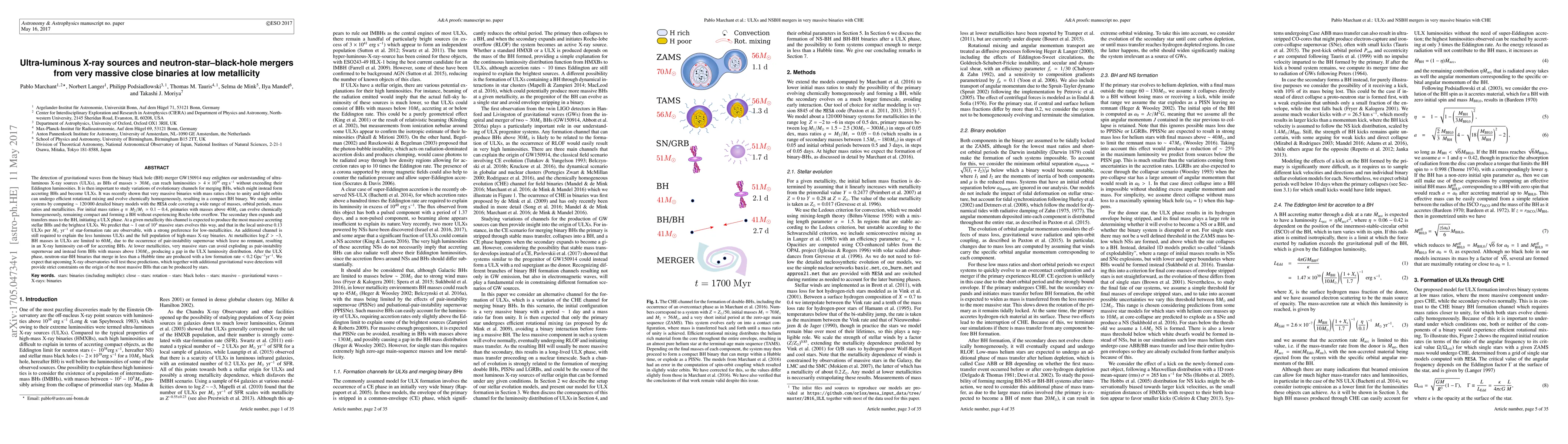 This paper investigates the formation of ultra-luminous X-ray sources (ULXs) and neutron-star-black-hole mergers in very massive close binaries at low metallicity, predicting that such systems can produce ULXs with black holes exceeding 130Msun, and neutron-star-black-hole binaries that merge within a Hubble time.
