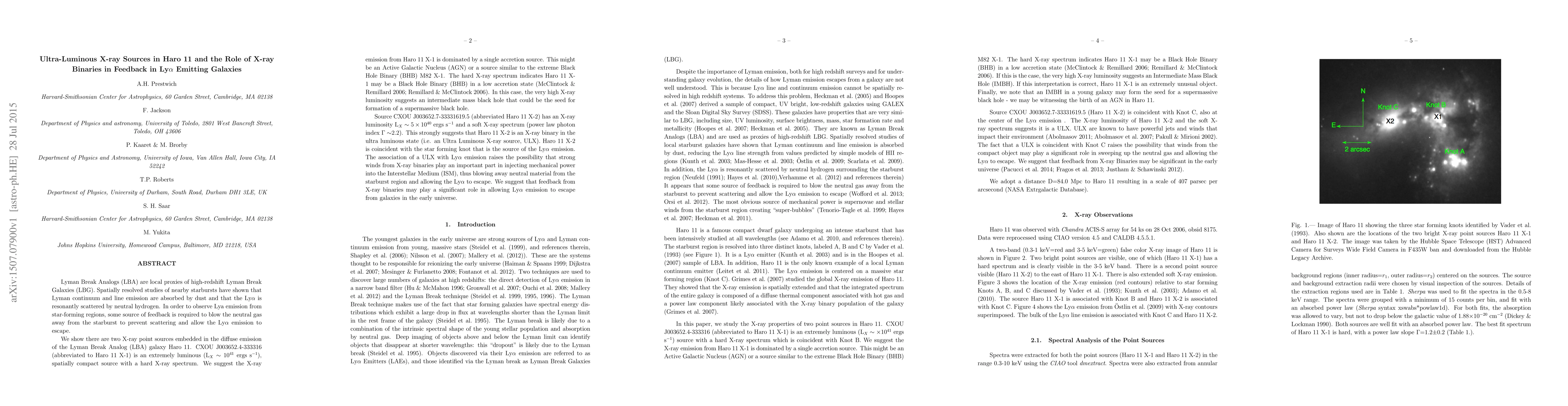 This paper investigates ultra-luminous X-ray sources in the Lyman Break Analog galaxy Haro 11, proposing that X-ray binaries contribute to feedback mechanisms allowing Lyman-alpha emission to escape, thus influencing star formation and galaxy evolution.