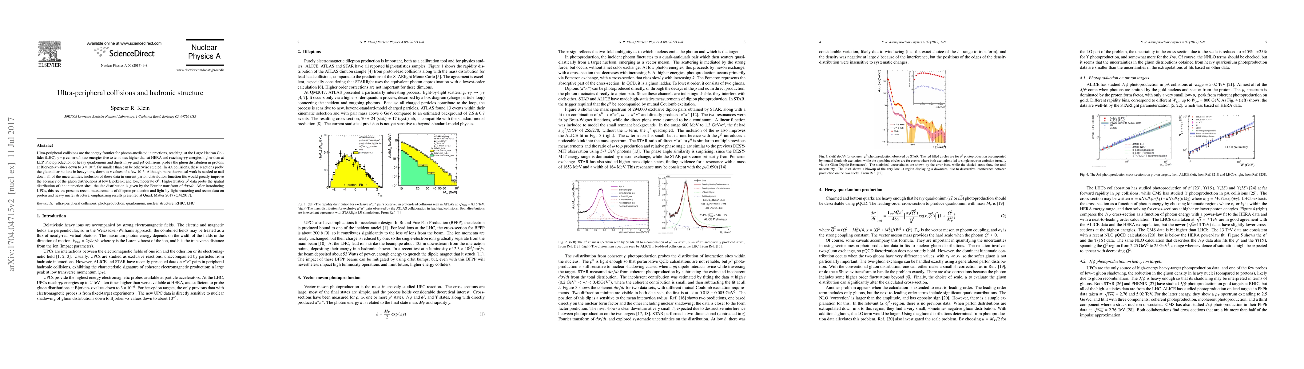 Ultra-peripheral collisions are the energy frontier for photon-mediated interactions, reaching, at the Large Hadron Collider (LHC), $\gamma-p$ center of mass energies five to ten times higher than at HERA and reaching $\gamma\gamma$ energies higher than at LEP. Photoproduction of heavy quarkonium and dijets in $pp$ and $pA$ collisions probes the gluon distribution in protons at Bjorken-$x$ values down to $3\times10^{-6}$, far smaller than can be otherwise studied. In $AA$ collisions, these reactions probe the gluon distributions in heavy ions, down to $x$ values of a few $10^{-5}$. Although more theoretical work is needed to nail down all of the uncertainties, inclusion of these data in current parton distribution function fits would greatly improve the accuracy of the gluon distributions at low Bjorken-$x$ and low/moderate $Q^2$. High-statistics $\rho^0$ data probe the spatial distribution of the interaction sites; the site distribution is given by the Fourier transform of $d\sigma/dt$. After introducing UPCs, this review presents recent measurements of dilepton production and light-by-light scattering and recent data on proton and heavy nuclei structure, emphasizing results presented at Quark Matter 2017 (QM2017).