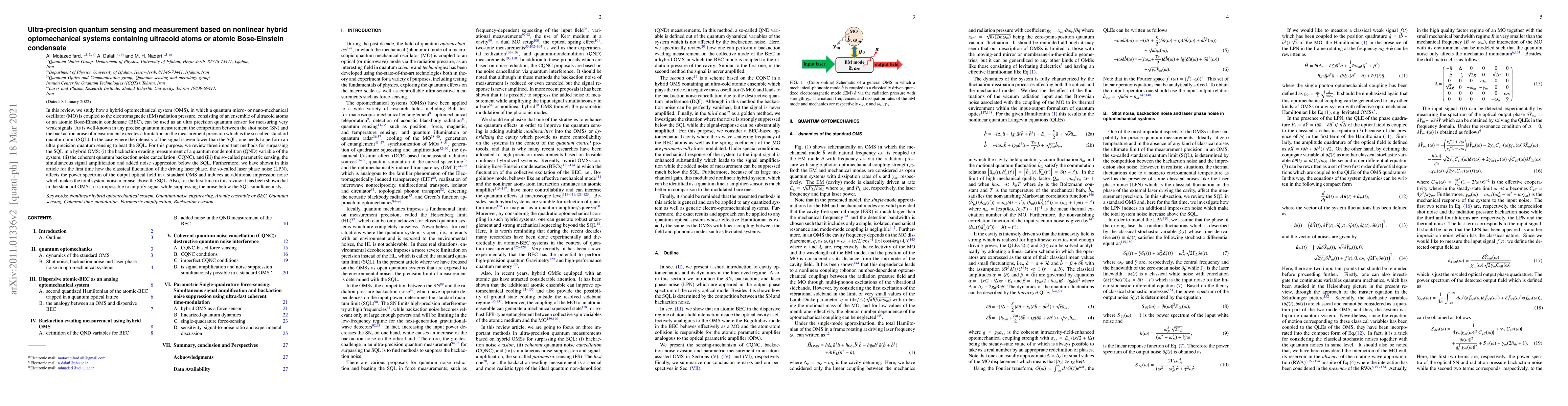 In this review, we study how a hybrid optomechanical system (OMS), in which a quantum micro- or nano-mechanical oscillator (MO) is coupled to the electromagnetic (EM) radiation pressure, consisting of an ensemble of ultracold atoms or an atomic Bose-Einstein condensate (BEC), can be used as an ultra precision quantum sensor for measuring very weak signals. As is well-known in any precise quantum measurement the competition between the shot noise (SN) and the backaction noise of measurement executes a limitation on the measurement precision which is the so-called standard quantum limit (SQL). In the case where the intensity of the signal is even lower than the SQL, one needs to perform an ultra precision quantum sensing to beat the SQL. For this purpose, we review three important methods for surpassing the SQL in a hybrid OMS: (i) the backaction evading measurement of a quantum nondemolition (QND) variable of the system, (ii) the coherent quantum backaction noise cancellation (CQNC), and (iii) the so-called parametric sensing, the simultaneous signal amplification and added noise suppression below the SQL. Furthermore, we have shown in this article for the first time how the classical fluctuation of the driving laser phase, the so-called laser phase noise (LPN), affects the power spectrum of the output optical field in a standard OMS and induces an additional impression noise which makes the total system noise increase above the SQL. Also, for the first time in this review it has been shown that in the standard OMSs, it is impossible to amplify signal while suppressing the noise below the SQL simultaneously.
