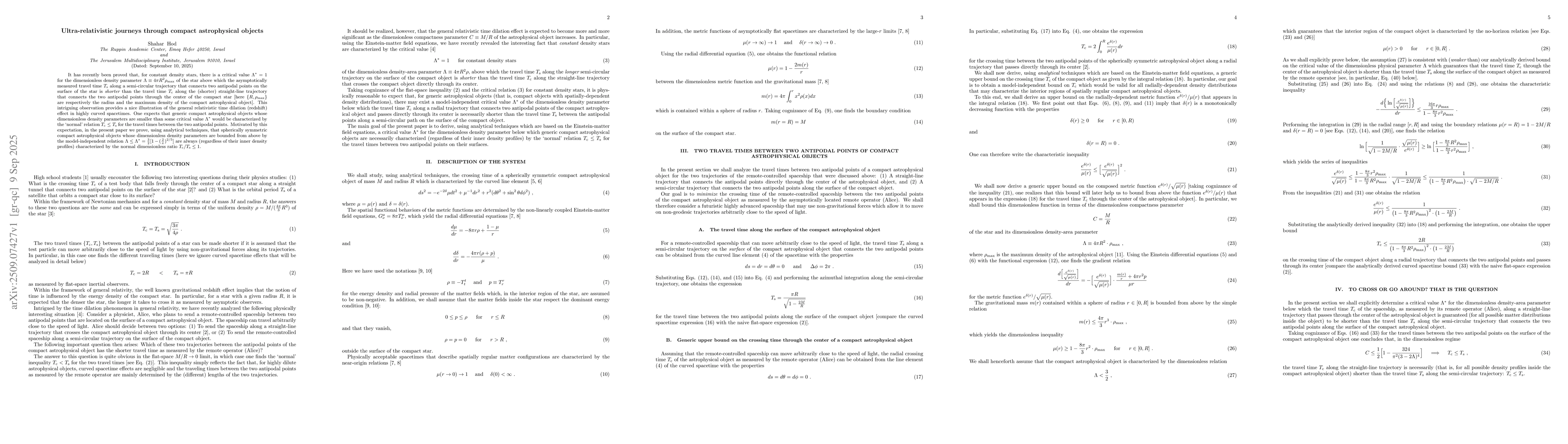 It has recently been proved that, for constant density stars, there is a critical value $\Lambda^{*}=1$ for the dimensionless density parameter $\Lambda\equiv 4\pi R^2\rho_{\text{max}}$ of the star above which the asymptotically measured travel time $T_{\text{s}}$ along a semi-circular trajectory that connects two antipodal points on the surface of the star is {\it shorter} than the travel time $T_{\text{c}}$ along the (shorter) straight-line trajectory that connects the two antipodal points through the center of the compact star [here $\{R,\rho_{\text{max}}\}$ are respectively the radius and the maximum density of the compact astrophysical object]. This intriguing observation provides a nice illustration of the general relativistic time dilation (redshift) effect in highly curved spacetimes. One expects that generic compact astrophysical objects whose dimensionless density parameters are smaller than some critical value $\Lambda^*$ would be characterized by the `normal' relation $T_{\text{c}}\leq T_{\text{s}}$ for the travel times between the two antipodal points. Motivated by this expectation, in the present paper we prove, using analytical techniques, that spherically symmetric compact astrophysical objects whose dimensionless density parameters are bounded from above by the model-independent relation $\Lambda\leq\Lambda^*={3\over2}[1-({{2}\over{\pi}})^{2/5}]$ are always (regardless of their inner density profiles) characterized by the normal dimensionless ratio $T_{\text{c}}/T_{\text{s}}\leq1$.