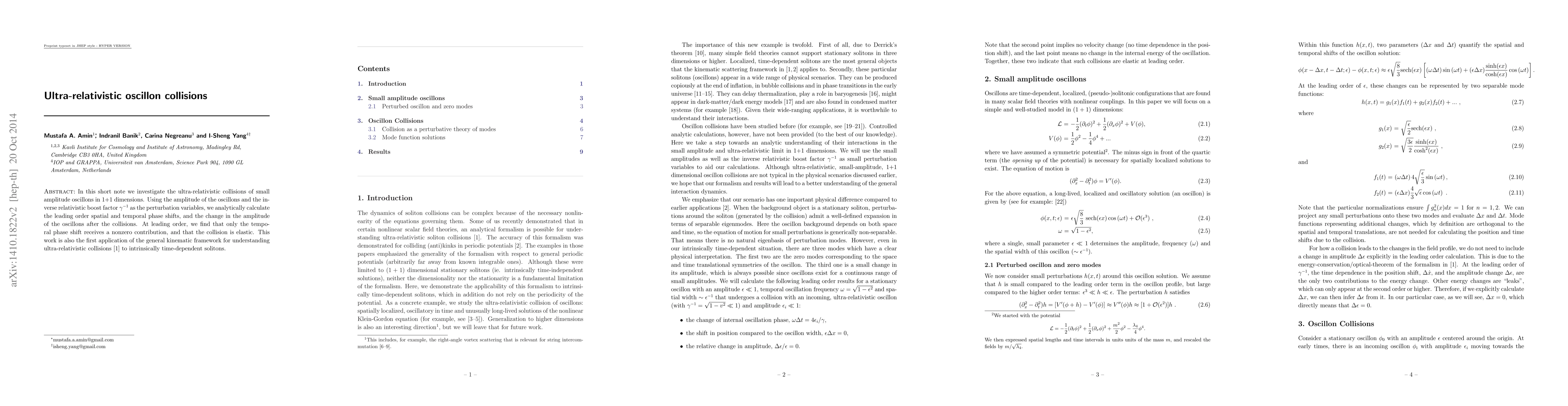 This paper investigates ultra-relativistic collisions of small amplitude oscillons in 1+1 dimensions, finding that the temporal phase shift is nonzero while the collision is elastic. It applies a general kinematic framework to intrinsically time-dependent solitons for the first time.