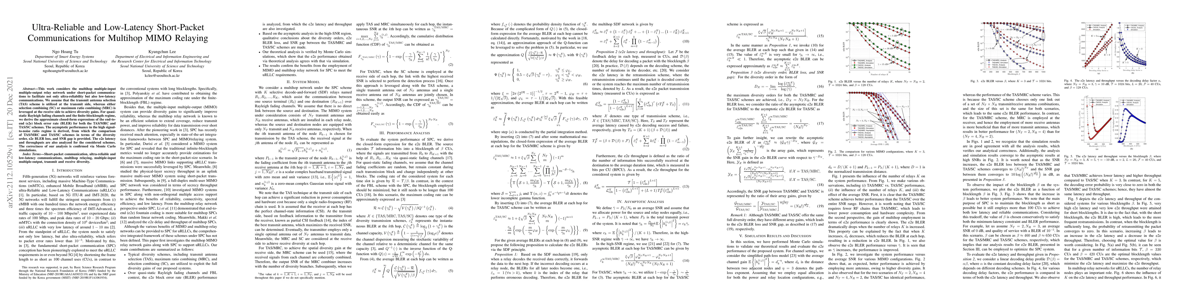 This paper investigates ultra-reliable and low-latency short-packet communications in multihop MIMO relay networks, deriving closed-form expressions for end-to-end block error rates and analyzing the performance of transmit antenna selection with maximum ratio combining versus selection combining.