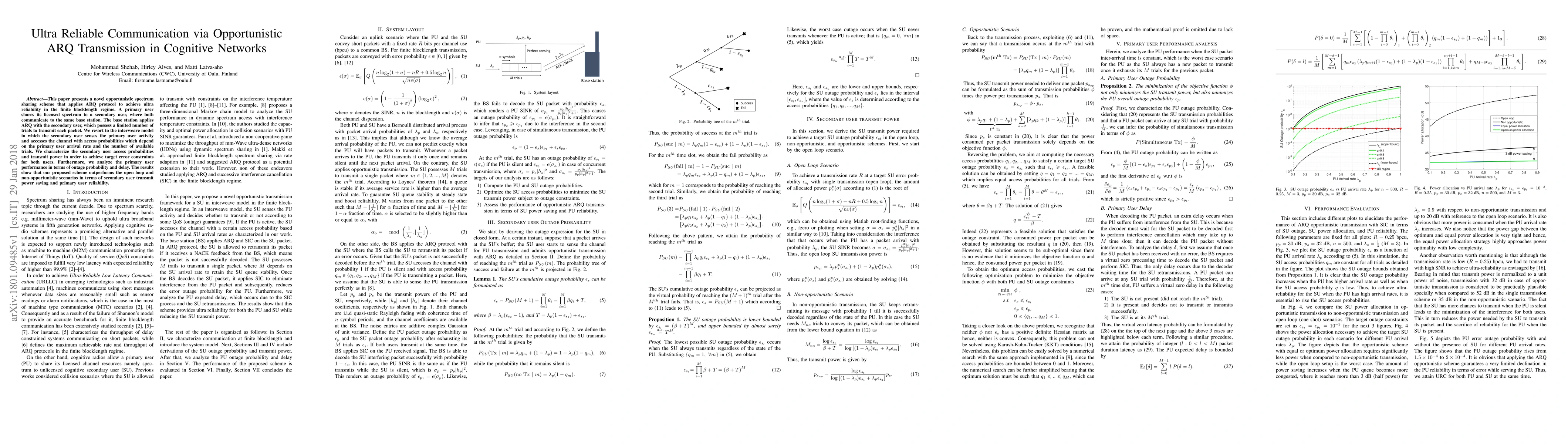 This paper proposes an opportunistic spectrum sharing scheme using ARQ protocol for ultra-reliable communication in cognitive networks. It shows that the scheme outperforms traditional methods in terms of secondary user power saving and primary user reliability, providing improved performance in outage probability and delay.