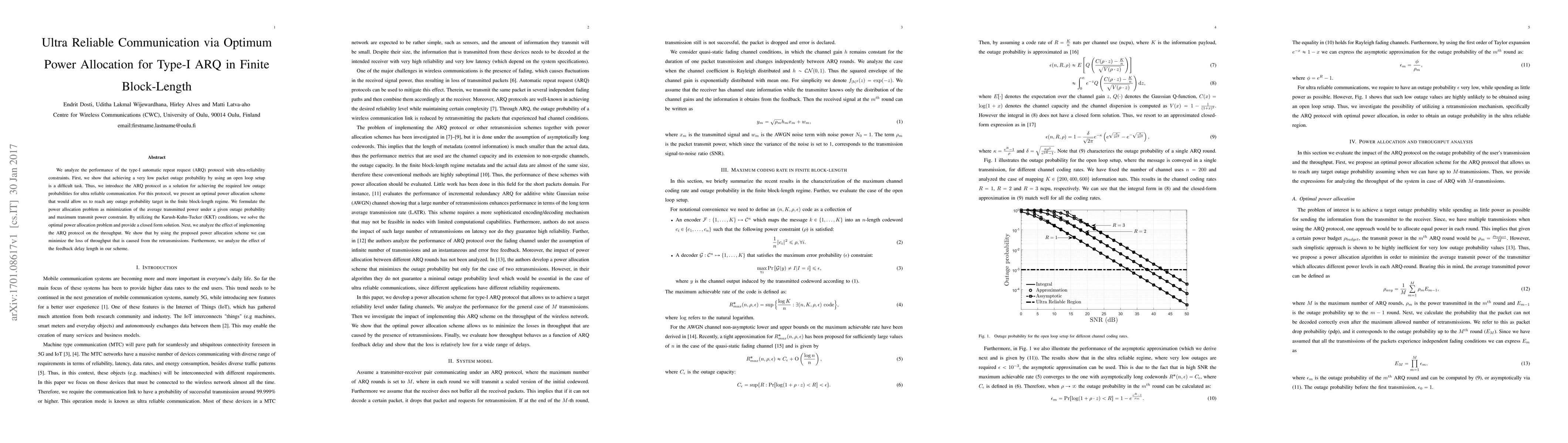 This paper investigates the performance of type-I ARQ protocol for ultra reliable communication under finite block-length constraints, proposing an optimal power allocation scheme to achieve low outage probabilities. The study utilizes the Karush-Kuhn-Tucker conditions to derive a closed-form solution for power allocation, minimizing throughput loss due to retransmissions and analyzing the impact of feedback delay length.