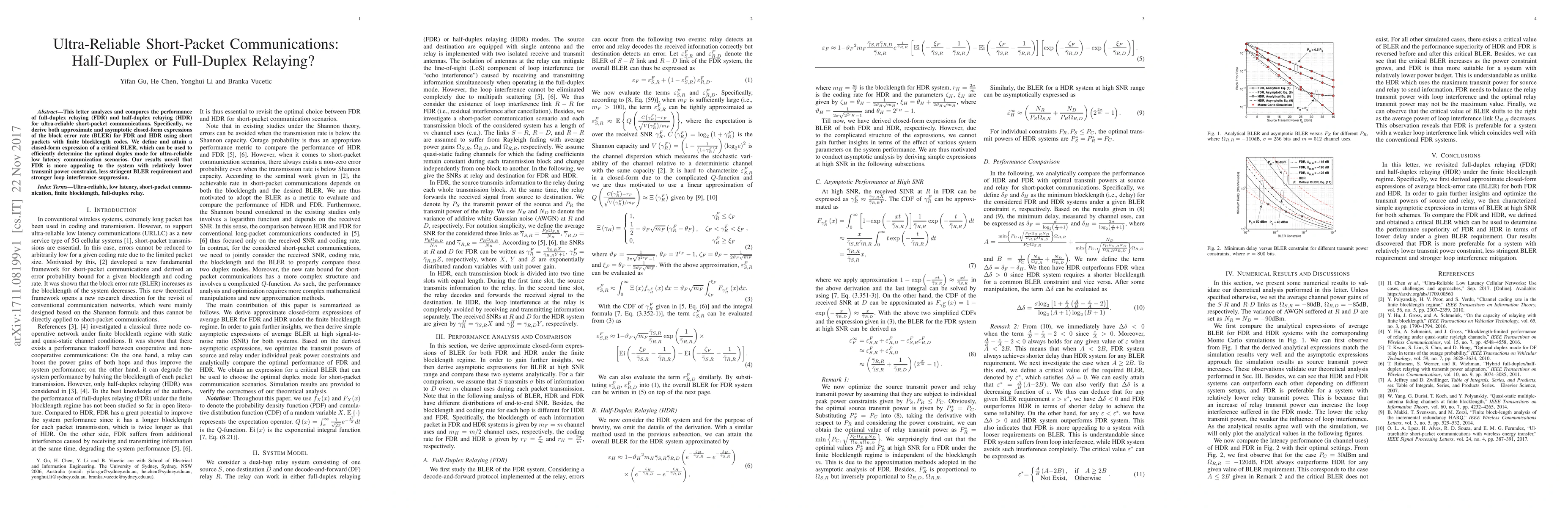 This paper compares the performance of full-duplex and half-duplex relaying for ultra-reliable short-packet communications, deriving closed-form expressions for block error rates. It concludes that full-duplex relaying is preferable under lower power constraints, less stringent error requirements, and effective loop interference suppression.
