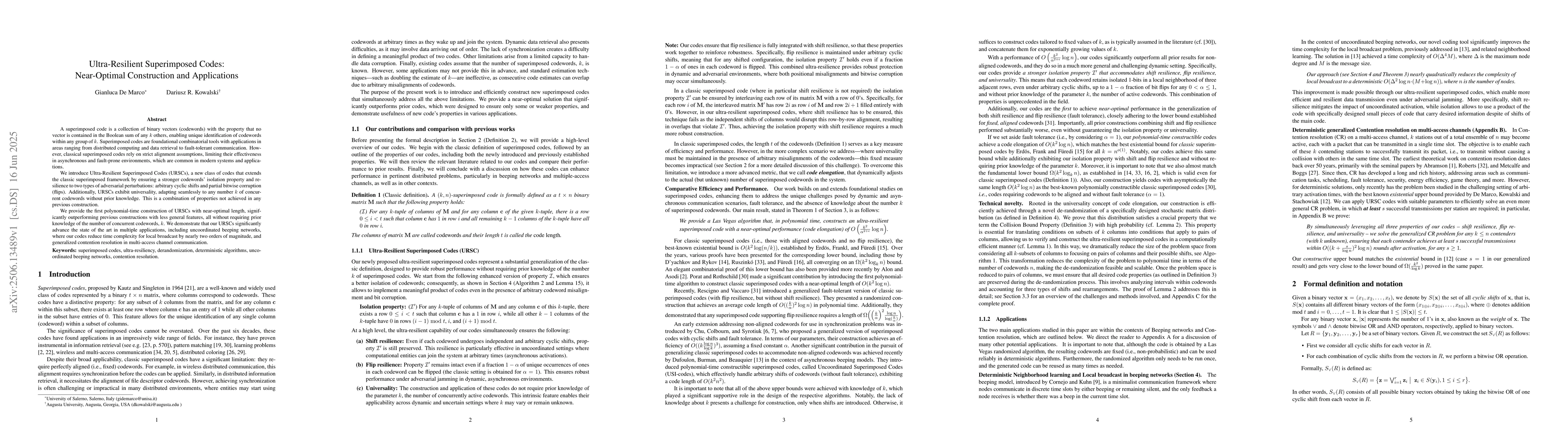 A superimposed code is a collection of binary vectors (codewords) with the property that no vector is contained in the Boolean sum of any $k$ others, enabling unique identification of codewords within any group of $k$. Superimposed codes are foundational combinatorial tools with applications in areas ranging from distributed computing and data retrieval to fault-tolerant communication. However, classical superimposed codes rely on strict alignment assumptions, limiting their effectiveness in asynchronous and fault-prone environments, which are common in modern systems and applications. We introduce Ultra-Resilient Superimposed Codes (URSCs), a new class of codes that extends the classic superimposed framework by ensuring a stronger codewords' isolation property and resilience to two types of adversarial perturbations: arbitrary cyclic shifts and partial bitwise corruption (flips). Additionally, URSCs exhibit universality, adapting seamlessly to any number $k$ of concurrent codewords without prior knowledge. This is a combination of properties not achieved in any previous construction. We provide the first polynomial-time construction of URSCs with near-optimal length, significantly outperforming previous constructions with less general features, all without requiring prior knowledge of the number of concurrent codewords, $k$. % We demonstrate that our URSCs significantly advance the state of the art in multiple applications, including uncoordinated beeping networks, where our codes reduce time complexity for local broadcast by nearly two orders of magnitude, and generalized contention resolution in multi-access channel communication.