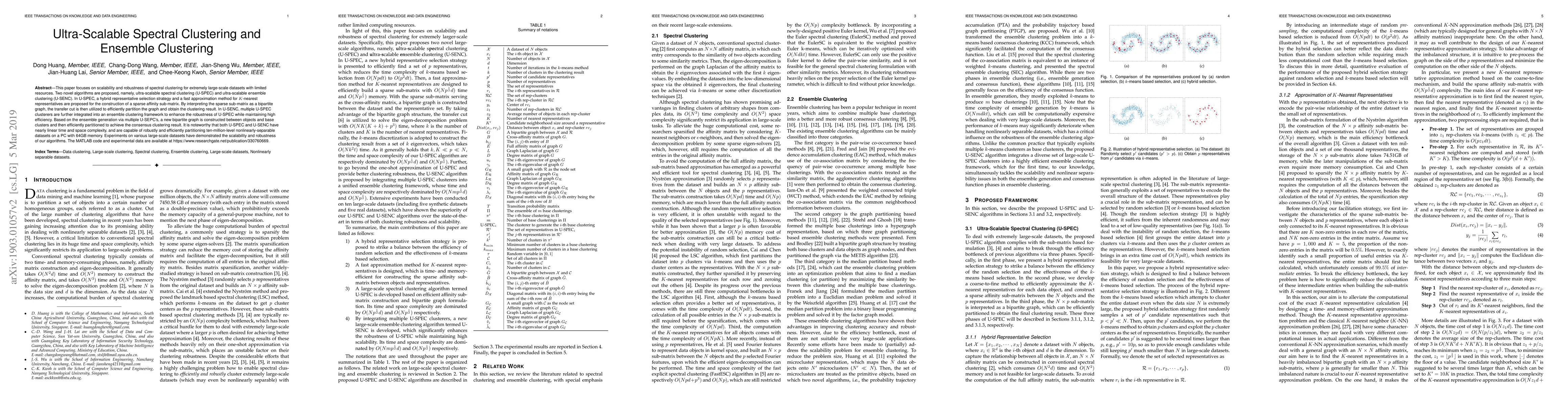 This paper introduces ultra-scalable spectral clustering (U-SPEC) and ultra-scalable ensemble clustering (U-SENC) algorithms for efficiently partitioning large-scale datasets. Both algorithms achieve nearly linear time and space complexity, enabling robust clustering of ten-million-level datasets on standard PCs.