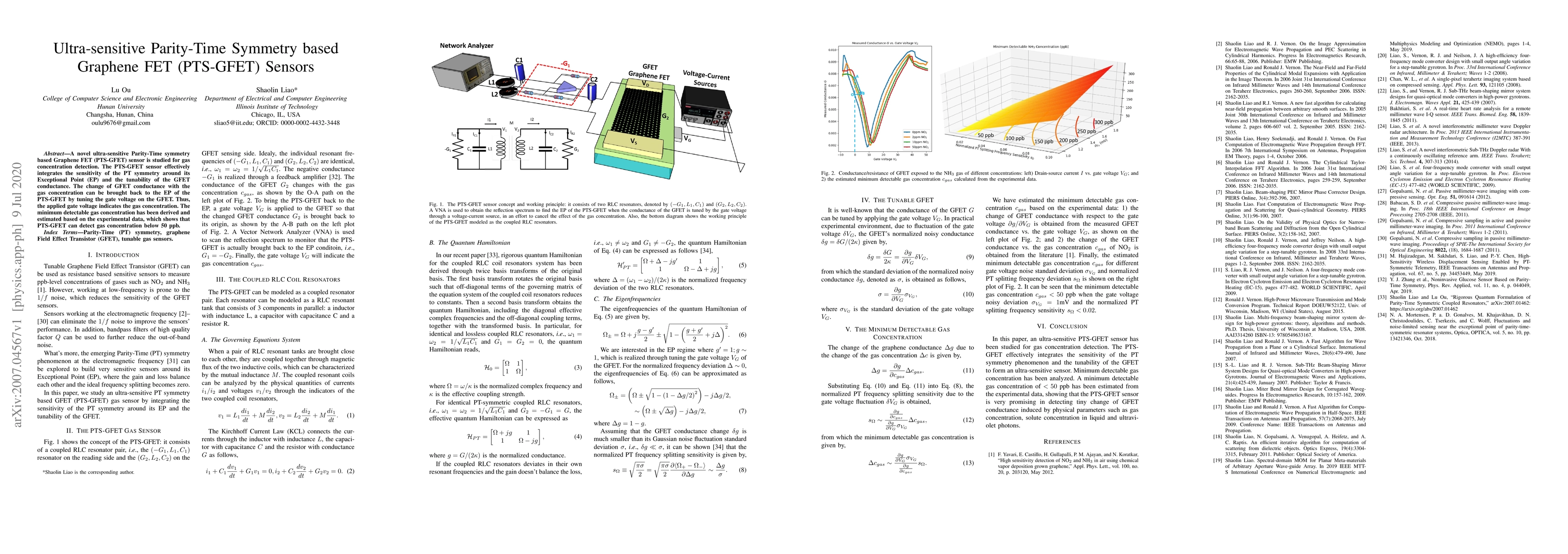 This research introduces an ultra-sensitive PTS-GFET sensor that leverages parity-time symmetry near its Exceptional Point and graphene FET's tunability for gas detection. The sensor achieves detection of gas concentrations as low as 50 ppb by adjusting the gate voltage to reflect gas concentration changes.