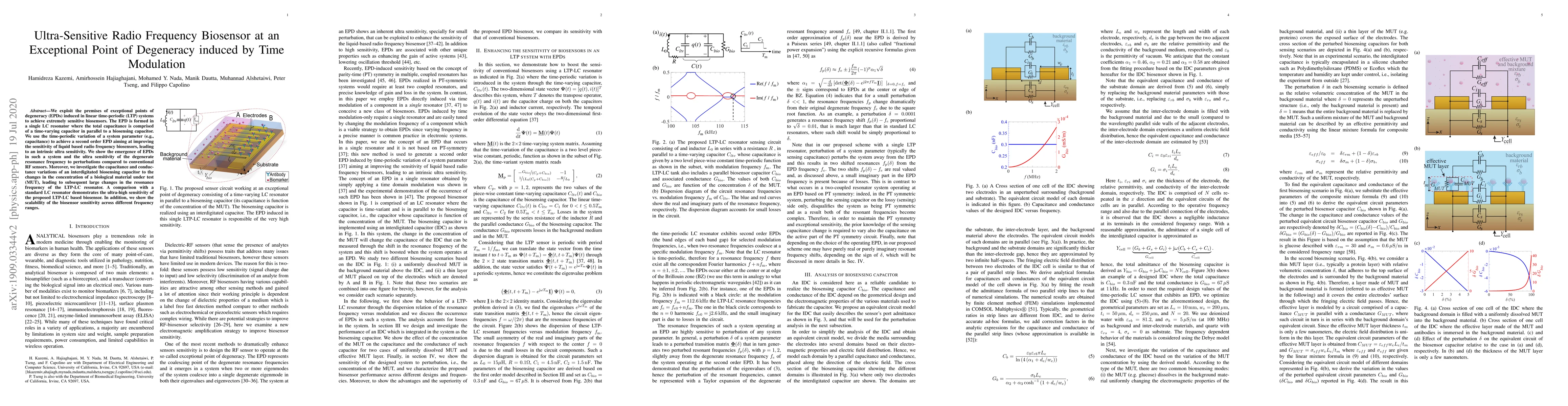 We exploit the premises of exceptional points of degeneracy (EPDs) induced in linear time-periodic (LTP) systems to achieve extremely sensitive biosensors. The EPD is formed in a single LC resonator where the total capacitance is comprised of a time-varying capacitor in parallel to a biosensing capacitor. We use the time-periodic variation of a system parameter (e.g., capacitance) to achieve a second order EPD aiming at improving the sensitivity of liquid based radio frequency biosensors, leading to an intrinsic ultra sensitivity. We show the emergence of EPDs in such a system and the ultra sensitivity of the degenerate resonance frequency to perturbations compared to conventional RF sensors. Moreover, we investigate the capacitance and conductance variations of an interdigitated biosensing capacitor to the changes in the concentration of a biological material under test (MUT), leading to subsequent large changes in the resonance frequency of the LTP-LC resonator. A comparison with a standard LC resonator demonstrates the ultra-high sensitivity of the proposed LTP-LC based biosensor. In addition, we show the scalability of the biosensor sensitivity across different frequency ranges.