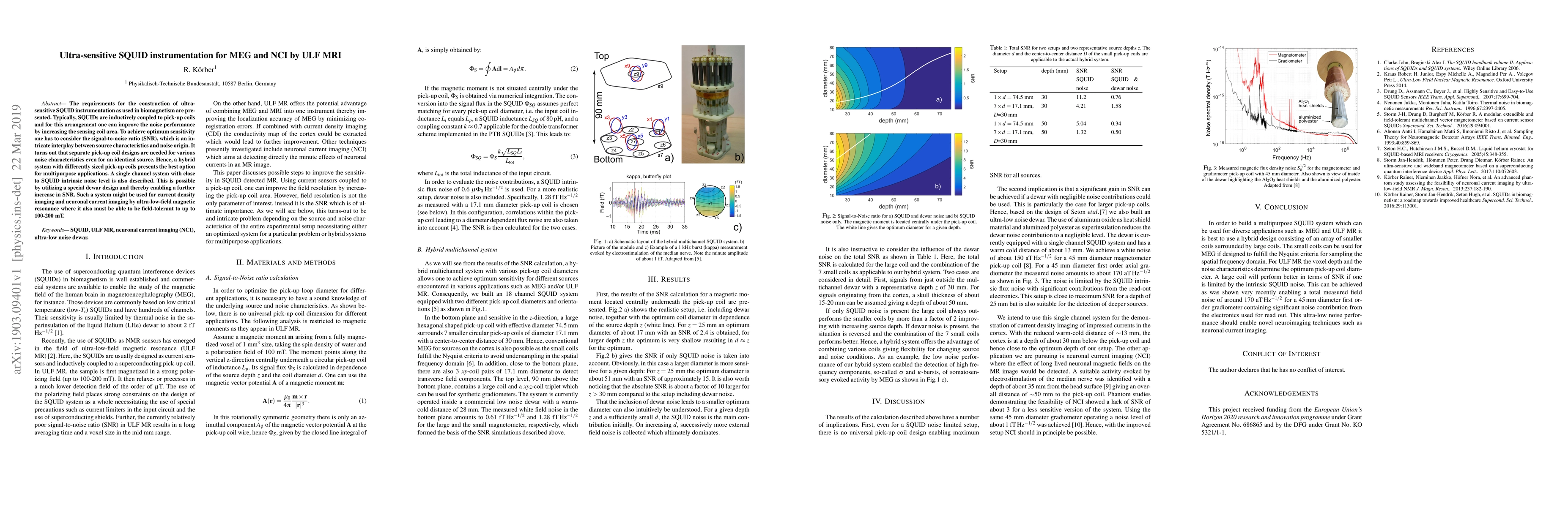 This paper discusses the development of ultra-sensitive SQUID instrumentation for biomagnetic applications, emphasizing the importance of optimizing the signal-to-noise ratio through tailored pick-up coil designs. The hybrid system with varied coil sizes offers the best sensitivity for diverse noise characteristics, while a single-channel system with minimal intrinsic noise is also presented, enabling advanced imaging techniques in ultra-low-field MRI.