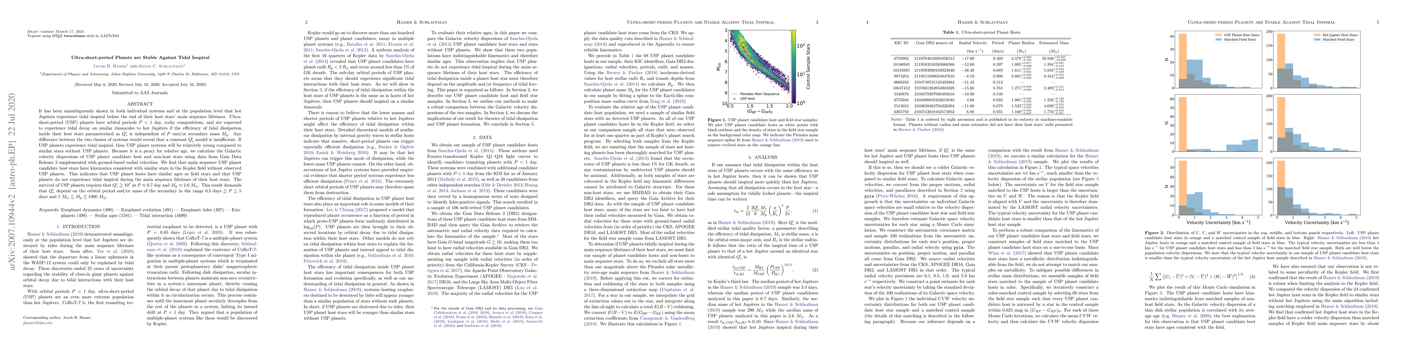 It has been unambiguously shown in both individual systems and at the population level that hot Jupiters experience tidal inspiral before the end of their host stars' main sequence lifetimes. Ultra-short-period (USP) planets have orbital periods $P < 1$ day, rocky compositions, and are expected to experience tidal decay on similar timescales to hot Jupiters if the efficiency of tidal dissipation inside their host stars parameterized as $Q_\ast'$ is independent of $P$ and/or secondary mass $M_{\mathrm{p}}$. Any difference between the two classes of systems would reveal that a constant $Q_\ast'$ model is insufficient. If USP planets experience tidal inspiral, then USP planet systems will be relatively young compared to similar stars without USP planets. Because it is a proxy for relative age, we calculate the Galactic velocity dispersions of USP planet candidate host and non-host stars using data from Gaia Data Release 2 supplemented with ground-based radial velocities. We find that main sequence USP planet candidate host stars have kinematics consistent with similar stars in the Kepler field without observed USP planets. This indicates that USP planet hosts have similar ages as field stars and that USP planets do not experience tidal inspiral during the main sequence lifetimes of their host stars. The survival of USP planets requires that $Q_\ast'\gtrsim10^7$ at $P\approx0.7$ day and $M_{\mathrm{p}}\approx2.6~M_{\oplus}$. This result demands that $Q_\ast'$ depend on the orbital period and/or mass of the secondary in the range $0.5\mathrm{~days}\lesssim P\lesssim5$ days and $1~M_{\oplus}\lesssim M_{\mathrm{p}}\lesssim1000~M_{\oplus}$.