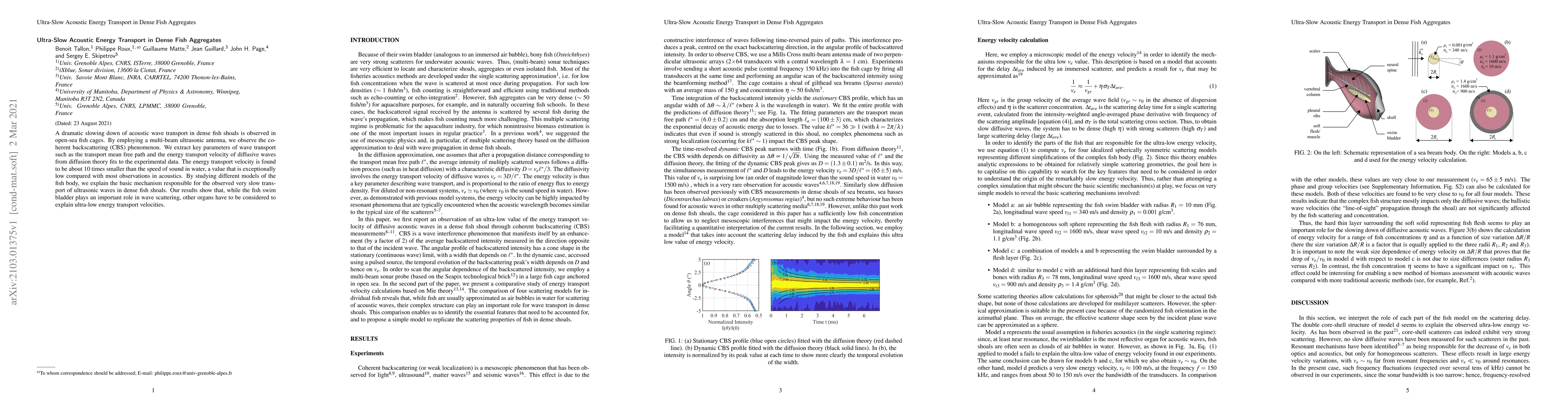 This research observes ultra-slow acoustic wave transport in dense fish shoals, 10 times slower than sound in water, using ultrasonic antenna and diffusion theory. The study suggests fish organs, not just swim bladders, contribute to this phenomenon.
