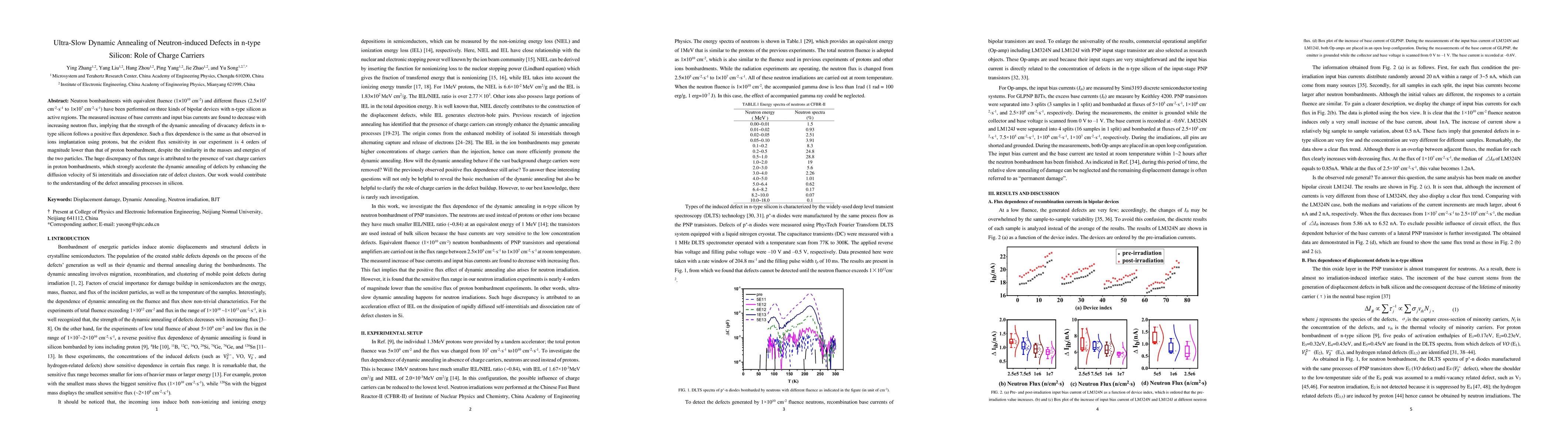 Neutron bombardments with equivalent fluence (1$\times$10$^{10}$ cm$^{-2}$) and different fluxes ($2.5\times$10$^5$ cm$^{-2}$s$^{-1}$ to $1\times$10$^7$ cm$^{-2}$s$^{-1}$) have been performed on three kinds of bipolar devices with n-type silicon as active regions. The measured increase of base currents and input bias currents are found to decrease with increasing neutron flux, implying that the strength of the dynamic annealing of divacancy defects in n-type silicon follows a positive flux dependence. Such a flux dependence is the same as that observed in ions implantation using protons, but the evident flux sensitivity in our experiment is 4 orders of magnitude lower than that of proton bombardment, despite the similarity in the masses and energies of the two particles. The huge discrepancy of flux range is attributed to the presence of vast charge carriers in proton bombardments, which strongly accelerate the dynamic annealing of defects by enhancing the diffusion velocity of Si interstitials and dissociation rate of defect clusters. Our work would contribute to the understanding of the defect annealing processes in silicon.