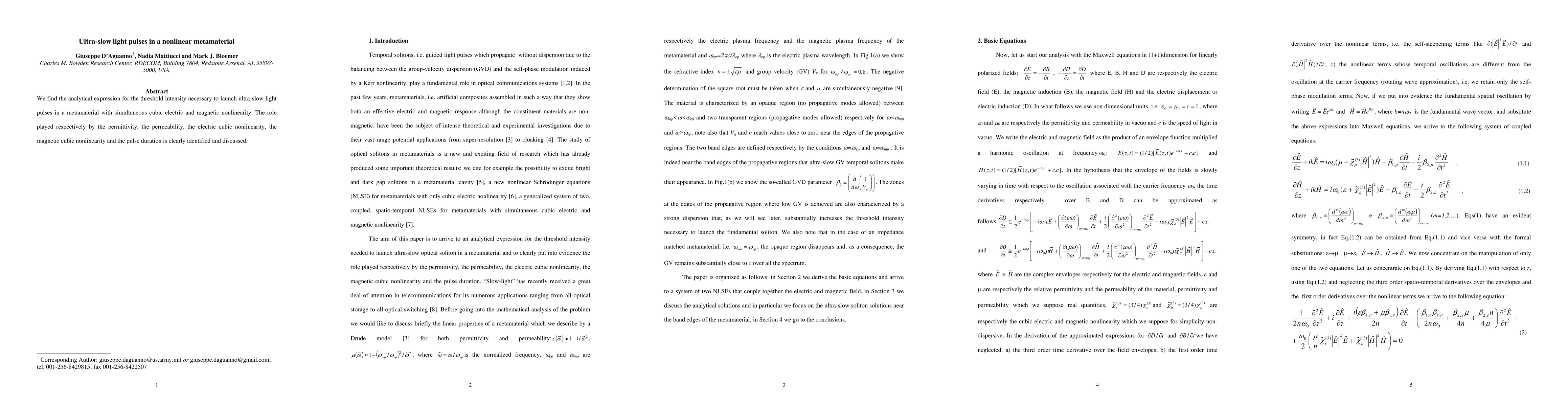 This work extends previous studies on slow light by considering both electric and magnetic cubic nonlinearities, providing a comprehensive analytical framework for ultra-slow light pulse generation in metamaterials.