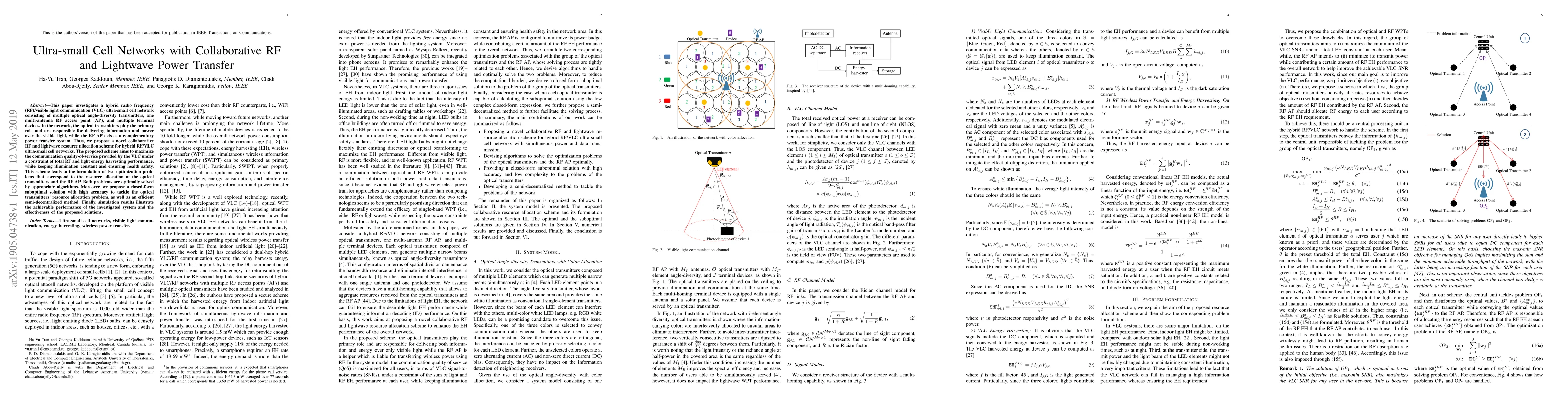 This paper proposes a hybrid RF/VLC ultra-small cell network with collaborative power transfer, optimizing resource allocation to maximize VLC communication quality while ensuring constant illumination and health safety. Simulation results demonstrate the system's performance and the effectiveness of the proposed resource allocation schemes.