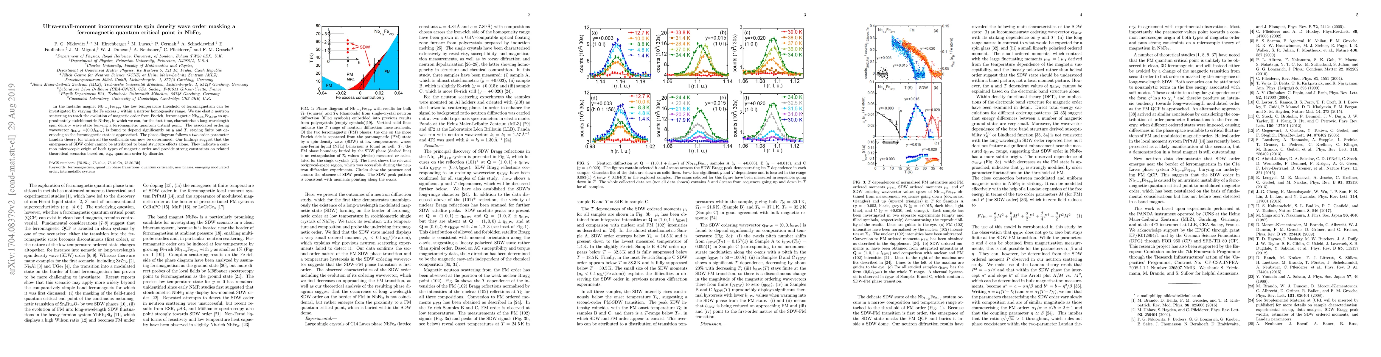In the metallic magnet Nb$_{1-y}$Fe$_{2+y}$, the low temperature threshold of ferromagnetism can be investigated by varying the Fe excess $y$ within a narrow homogeneity range. We use elastic neutron scattering to track the evolution of magnetic order from Fe-rich, ferromagnetic Nb$_{0.981}$Fe$_{2.019}$ to approximately stoichiometric NbFe$_2$, in which we can, for the first time, characterise a long-wavelength spin density wave state burying a ferromagnetic quantum critical point. The associated ordering wavevector $\mathbf{q}_{\rm SDW}=$(0,0,$l_{\rm SDW}$) is found to depend significantly on $y$ and $T$, staying finite but decreasing as the ferromagnetic state is approached. The phase diagram follows a two order-parameter Landau theory, for which all the coefficients can now be determined. Our findings suggest that the emergence of SDW order cannot be attributed to band structure effects alone. They indicate a common microscopic origin of both types of magnetic order and provide strong constraints on related theoretical scenarios based on, e.g., quantum order by disorder.