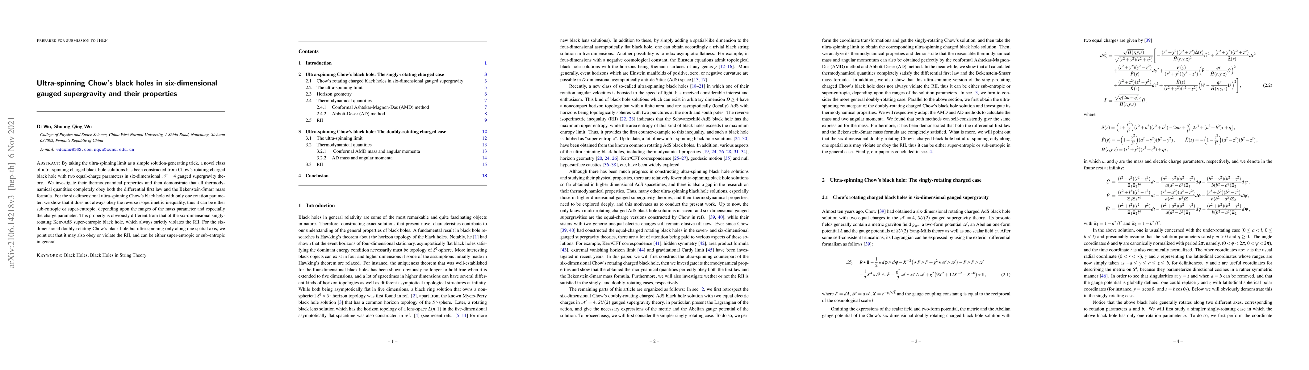 By taking the ultra-spinning limit as a simple solution-generating trick, a novel class of ultra-spinning charged black hole solutions has been constructed from Chow's rotating charged black hole with two equal-charge parameters in six-dimensional $\mathcal{N} = 4$ gauged supergravity theory. We investigate their thermodynamical properties and then demonstrate that all thermodynamical quantities completely obey both the differential first law and the Bekenstein-Smarr mass formula. For the six-dimensional ultra-spinning Chow's black hole with only one rotation parameter, we show that it does not always obey the reverse isoperimetric inequality, thus it can be either sub-entropic or super-entropic, depending upon the ranges of the mass parameter and especially the charge parameter. This property is obviously different from that of the six-dimensional singly-rotating Kerr-AdS super-entropic black hole, which always strictly violates the RII. For the six-dimensional doubly-rotating Chow's black hole but ultra-spinning only along one spatial axis, we point out that it may also obey or violate the RII, and can be either super-entropic or sub-entropic in general.