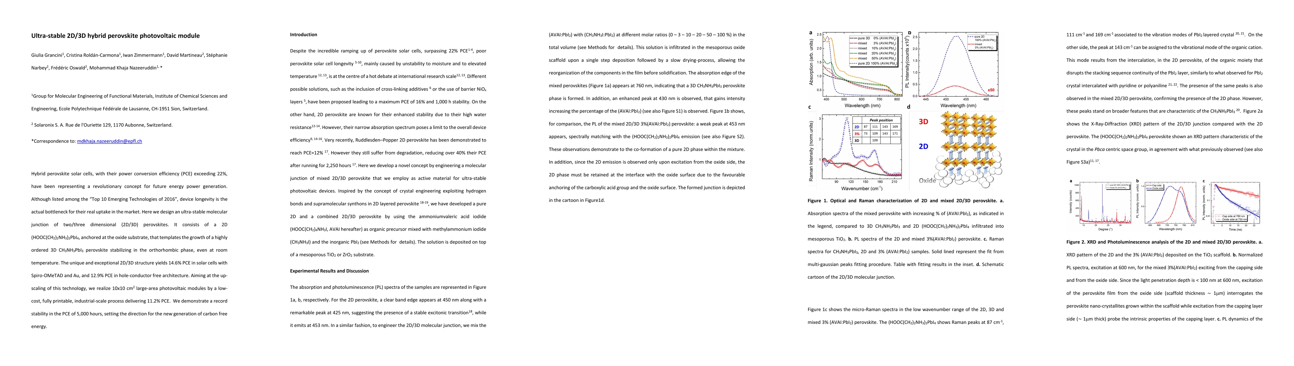Hybrid perovskite solar cells, with their power conversion efficiency (PCE) exceeding 22%, have been representing a revolutionary concept for future energy power generation. Although listed among the Top 10 Emerging Technologies of 2016, device longevity is the actual bottleneck for their real uptake in the market. Here we design an ultra-stable molecular junction of two/three dimensional (2D/3D) perovskites. It consists of a 2D (HOOC(CH2)2NH3)2PbI4, anchored at the oxide substrate, that templates the growth of a highly ordered 3D CH3NH3PbI3 perovskite stabilizing in the orthorhombic phase, even at room temperature. The unique and exceptional 2D/3D structure yields 14.6% PCE in solar cells with Spiro-OMeTAD and Au, and 12.9% PCE in hole-conductor free architecture. Aiming at the up-scaling of this technology, we realize 10x10 cm2 large-area photovoltaic modules by a low-cost, fully printable, industrial-scale process delivering 11.2% PCE. We demonstrate a record stability in the PCE of 5,000 hours, setting the direction for the new generation of carbon free energy.