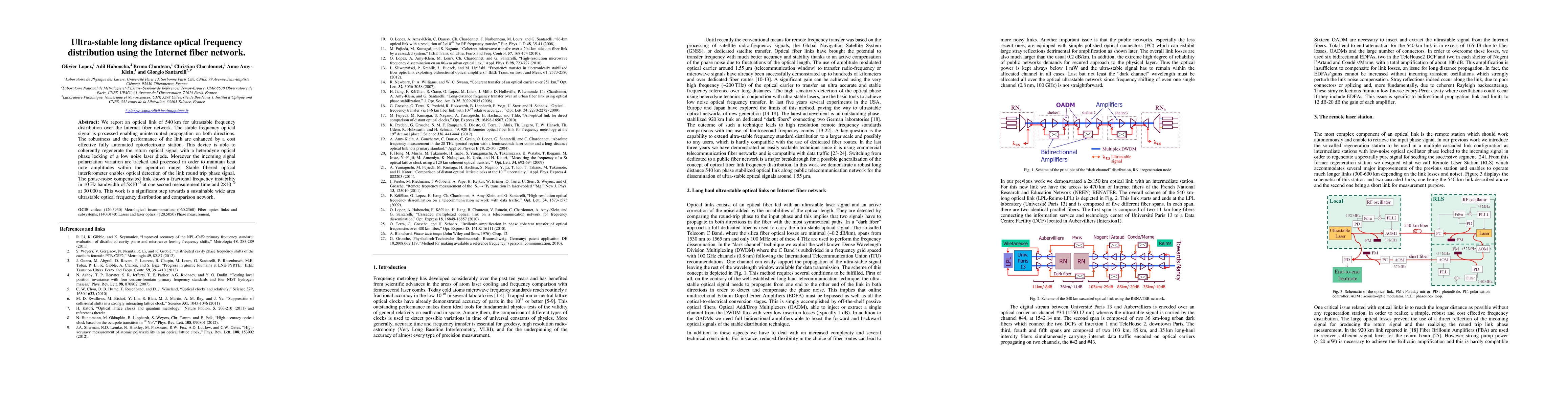 We report an optical link of 540 km for ultrastable frequency distribution over the Internet fiber network. The stable frequency optical signal is processed enabling uninterrupted propagation on both directions. The robustness and the performance of the link are enhanced by a cost effective fully automated optoelectronic station. This device is able to coherently regenerate the return optical signal with a heterodyne optical phase locking of a low noise laser diode. Moreover the incoming signal polarization variation are tracked and processed in order to maintain beat note amplitudes within the operation range. Stable fibered optical interferometer enables optical detection of the link round trip phase signal. The phase-noise compensated link shows a fractional frequency instability in 10 Hz bandwidth of 5x10-15 at one second measurement time and 2x10-19 at 30 000 s. This work is a significant step towards a sustainable wide area ultrastable optical frequency distribution and comparison network.