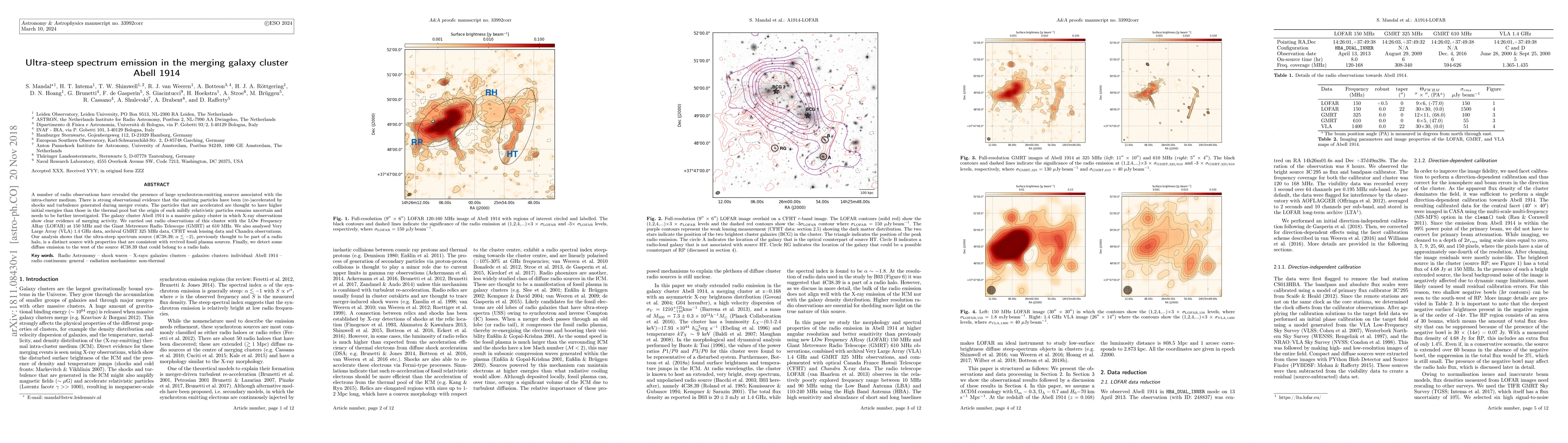 A number of radio observations have revealed the presence of large synchrotron-emitting sources associated with the intra-cluster medium. There is strong observational evidence that the emitting particles have been (re-)accelerated by shocks and turbulence generated during merger events. The particles that are accelerated are thought to have higher initial energies than those in the thermal pool but the origin of such mildly relativistic particles remains uncertain and needs to be further investigated. The galaxy cluster Abell 1914 is a massive galaxy cluster in which X-ray observations show clear evidence of merging activity. We carried out radio observations of this cluster with the LOw Frequency ARay (LOFAR) at 150 MHz and the Giant Metrewave Radio Telescope (GMRT) at 610 MHz. We also analysed Very Large Array (VLA) 1.4 GHz data, archival GMRT 325 MHz data, CFHT weak lensing data and Chandra observations. Our analysis shows that the ultra-steep spectrum source (4C38.39; $\alpha \lesssim -2$), previously thought to be part of a radio halo, is a distinct source with properties that are consistent with revived fossil plasma sources. Finally, we detect some diffuse emission to the west of the source 4C38.39 that could belong to a radio halo.