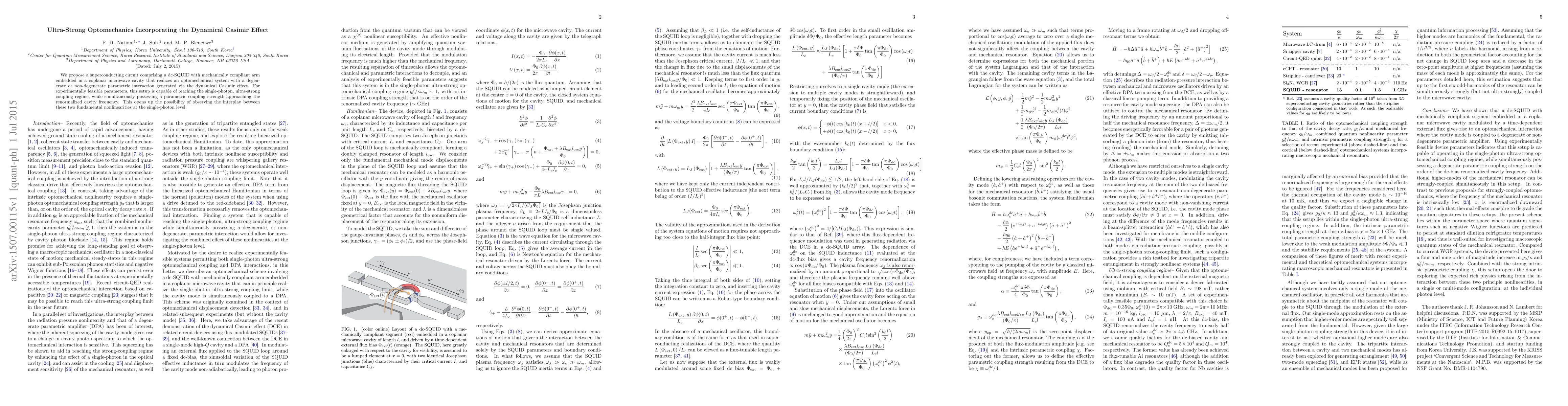 This paper proposes a superconducting circuit with a dc-SQUID and a compliant arm in a microwave cavity to achieve ultra-strong optomechanics via the dynamical Casimir effect, reaching single-photon coupling and parametric interaction strengths near the cavity frequency. This setup enables the observation of interactions between these nonlinearities at the single-photon level.
