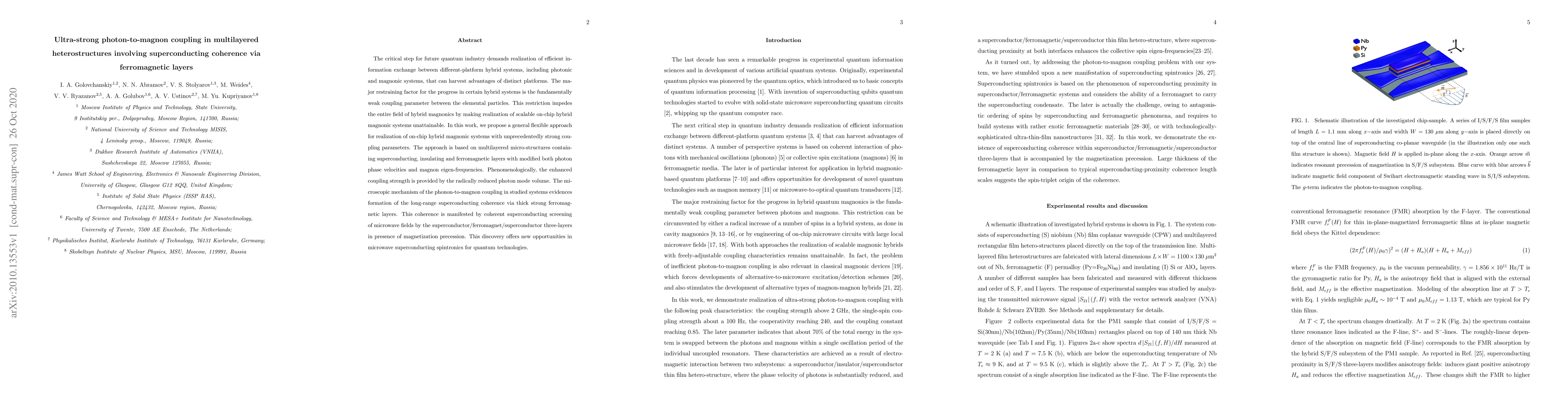 This paper proposes a novel multilayered heterostructure approach to achieve ultra-strong photon-to-magnon coupling, overcoming the weak coupling limitation in hybrid magnonic systems. The method leverages superconducting coherence via ferromagnetic layers to enhance coupling strength through reduced photon mode volume and long-range superconducting screening.