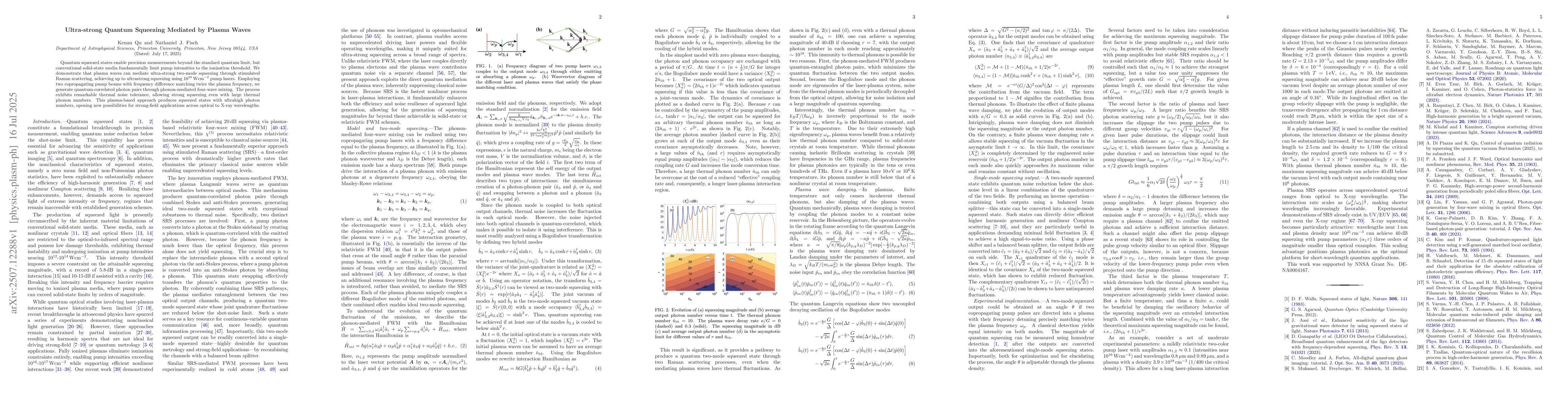 Quantum squeezed states enable precision measurements beyond the standard quantum limit, but conventional solid-state media fundamentally limit pump intensities to the ionization threshold. We demonstrate that plasma waves can mediate ultra-strong two-mode squeezing through stimulated Raman scattering, achieving up to ultrastrong squeezing using $10^{16}{Wcm^{-2}}$ pump lasers. Employing two copropagating pump beams with frequency difference matching twice the plasma frequency, we generate quantum-correlated photon pairs through phonon-mediated four-wave mixing. The process exhibits remarkable thermal noise tolerance, allowing strong squeezing even with large thermal phonon numbers. This plasma-based approach produces squeezed states with ultrahigh photon numbers, opening new possibilities for strong-field applications across optical to X-ray wavelengths.