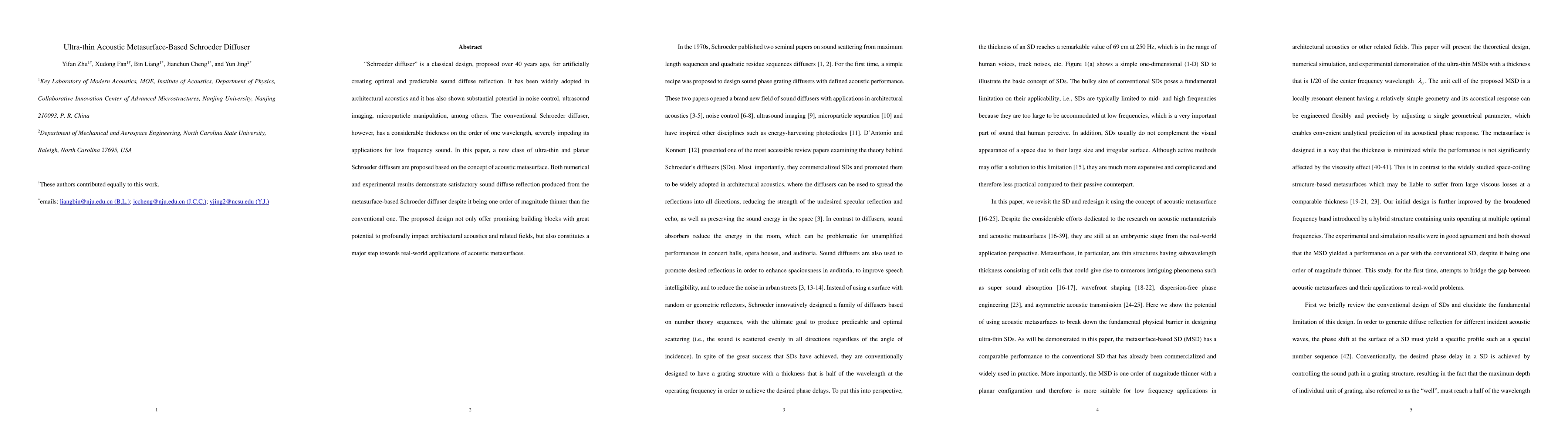 This paper proposes ultra-thin acoustic metasurface-based Schroeder diffusers, which achieve optimal sound diffuse reflection while being an order of magnitude thinner than conventional designs, thus broadening their application for low-frequency sound. The design shows promising potential for architectural acoustics and related fields.